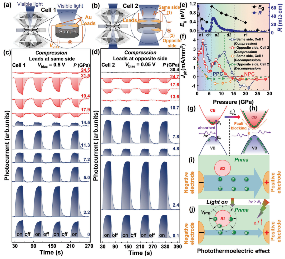 图2. PbSe0.5Te0.5在原位高压下光输运测量和光电流演化图谱,以及电阻和带隙在高压下的演化、PPC-NPC转变原理分析。