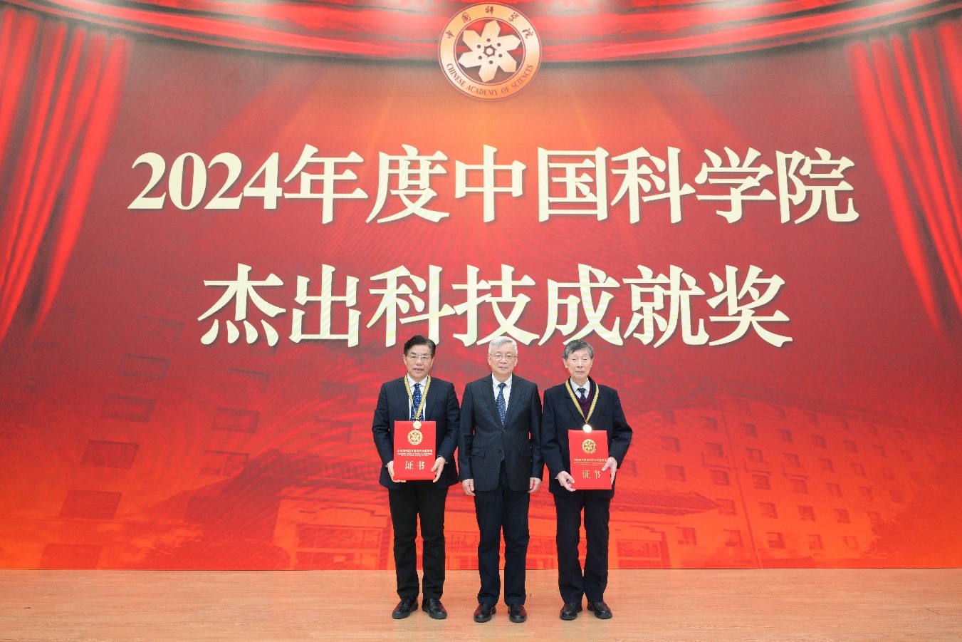 侯建国为获得2024年度中国科学院杰出科技成就奖个人成就奖的陈立泉院士、陈仙辉院士颁奖