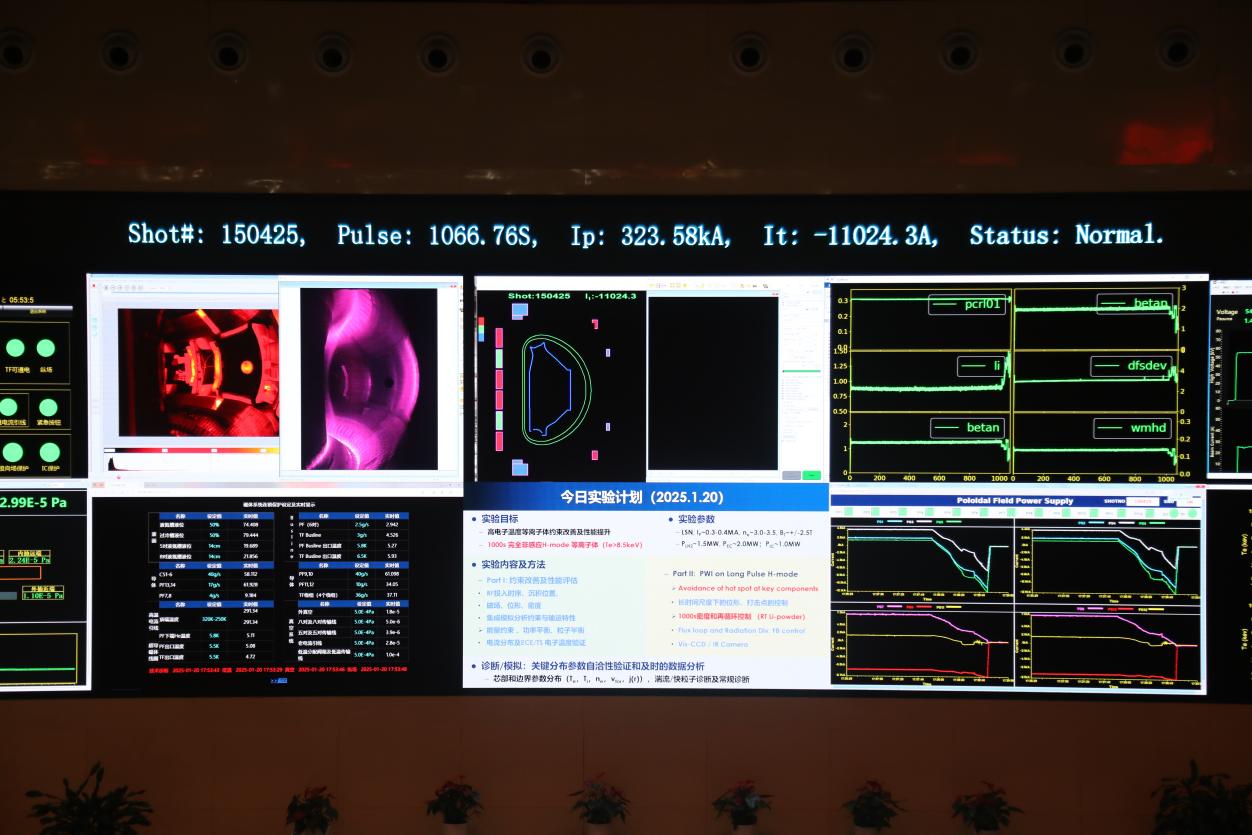 EAST装置自2006年建成运行以来,等离子体运行次数超过15万次,通过开放共享的建制化管理模式,在稳态等离子体运行的工程和物理上持续保持国际引领。就长脉冲高约束模运行来说,先后跨越60秒、100秒、400秒等重大里程碑,始终不断突破自我,挑战极限,冲击更高参数的长脉冲高约束模等离子体运行。2012年实现30秒高约束模,2016年实现60秒高约束模,2017年实现101秒高约束模,2023年实现403秒高约束模,2025年实现1066秒高约束模。