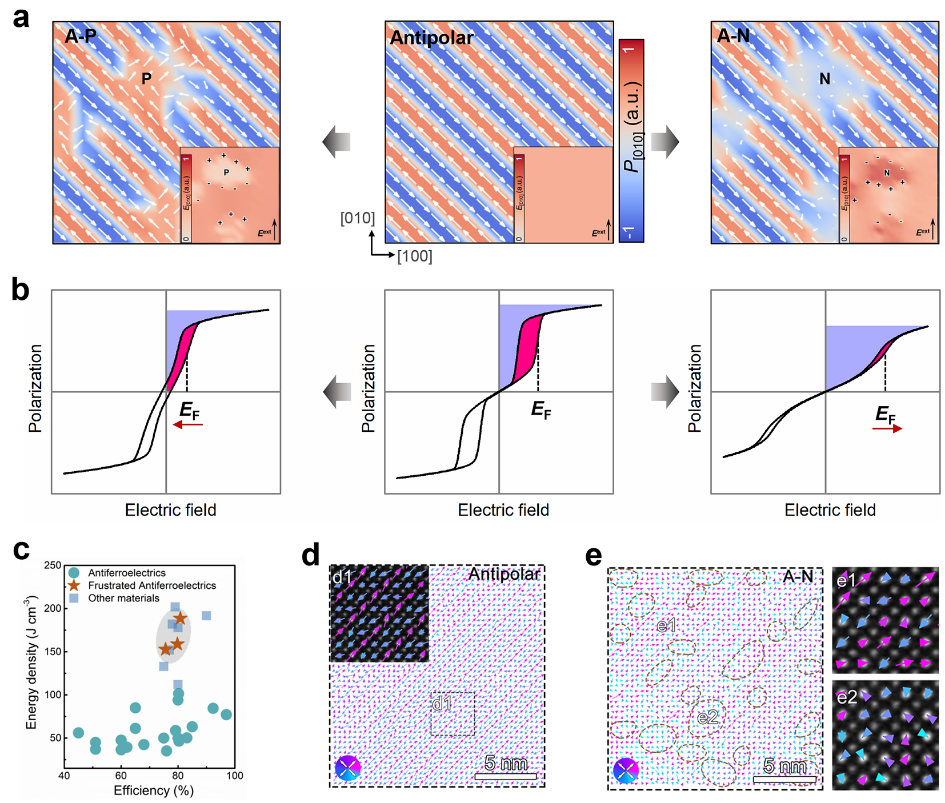 针对这一问题,研究人员在深入分析反铁电材料物理机制的基础上,提出了一种新的极化构型阻挫设计策略。他们通过在反铁电中引入非极性或极性组分,成功调控了反铁电-铁电相变场与回滞损耗。理论研究表明,构建局部阻挫微区导致极化不连续,诱导产生界面净电荷,形成了局部的内建电场。对于非极性微区阻挫的反铁电(A-N)结构,内建电场降低了反铁电区真实电场强度,从而延迟了反铁电-铁电相转变。撤去电场后,无自发极化的非极性区通过静电能效应带动反极性区快速恢复,减小了回滞损耗;而极性微区阻挫的反铁电(A-P)结构显示了相反的结果(图1a,b)。