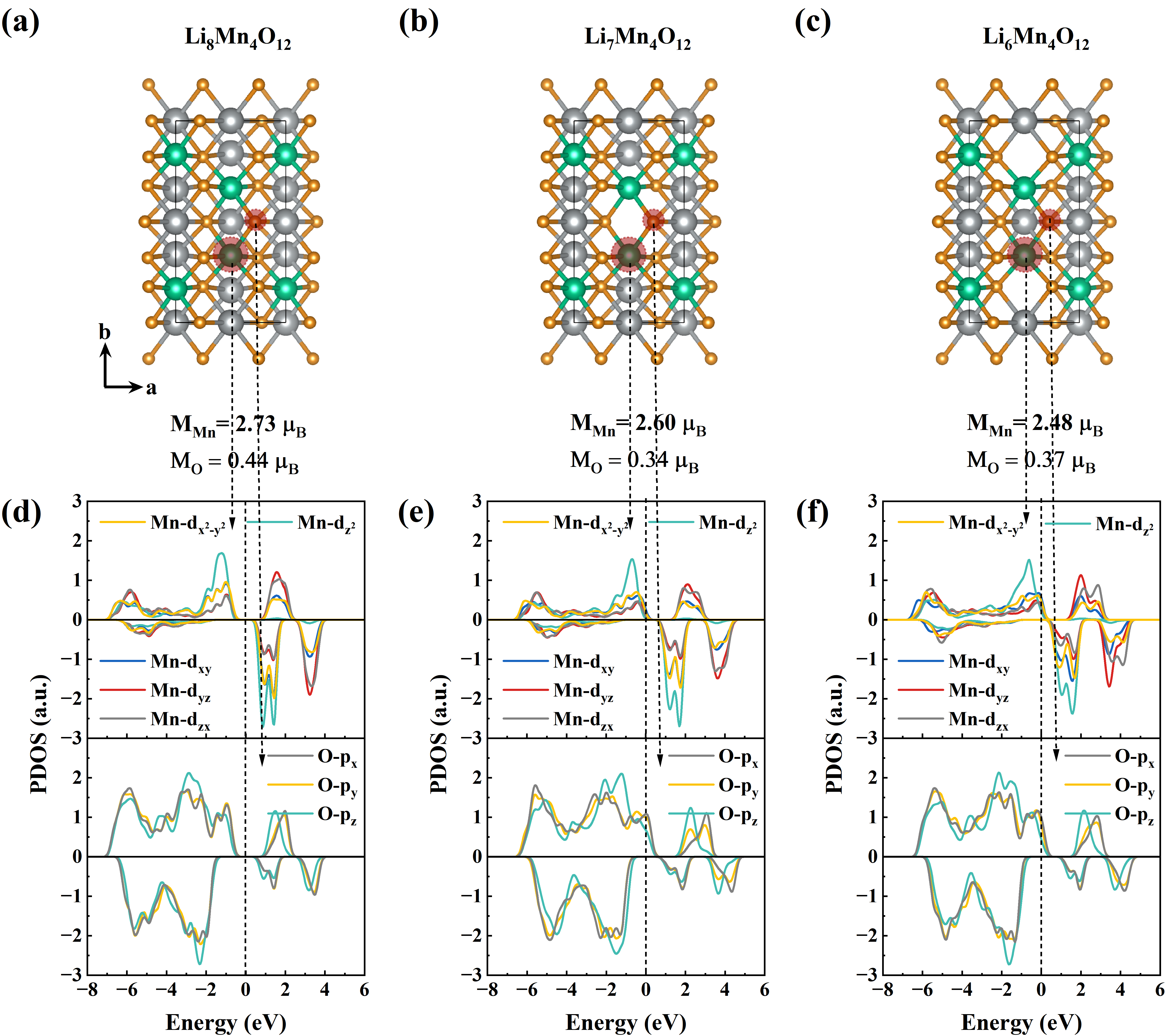图2. Li2MnO3在不同充电态下的结构模型以及相应的Mn和O态密度投影。