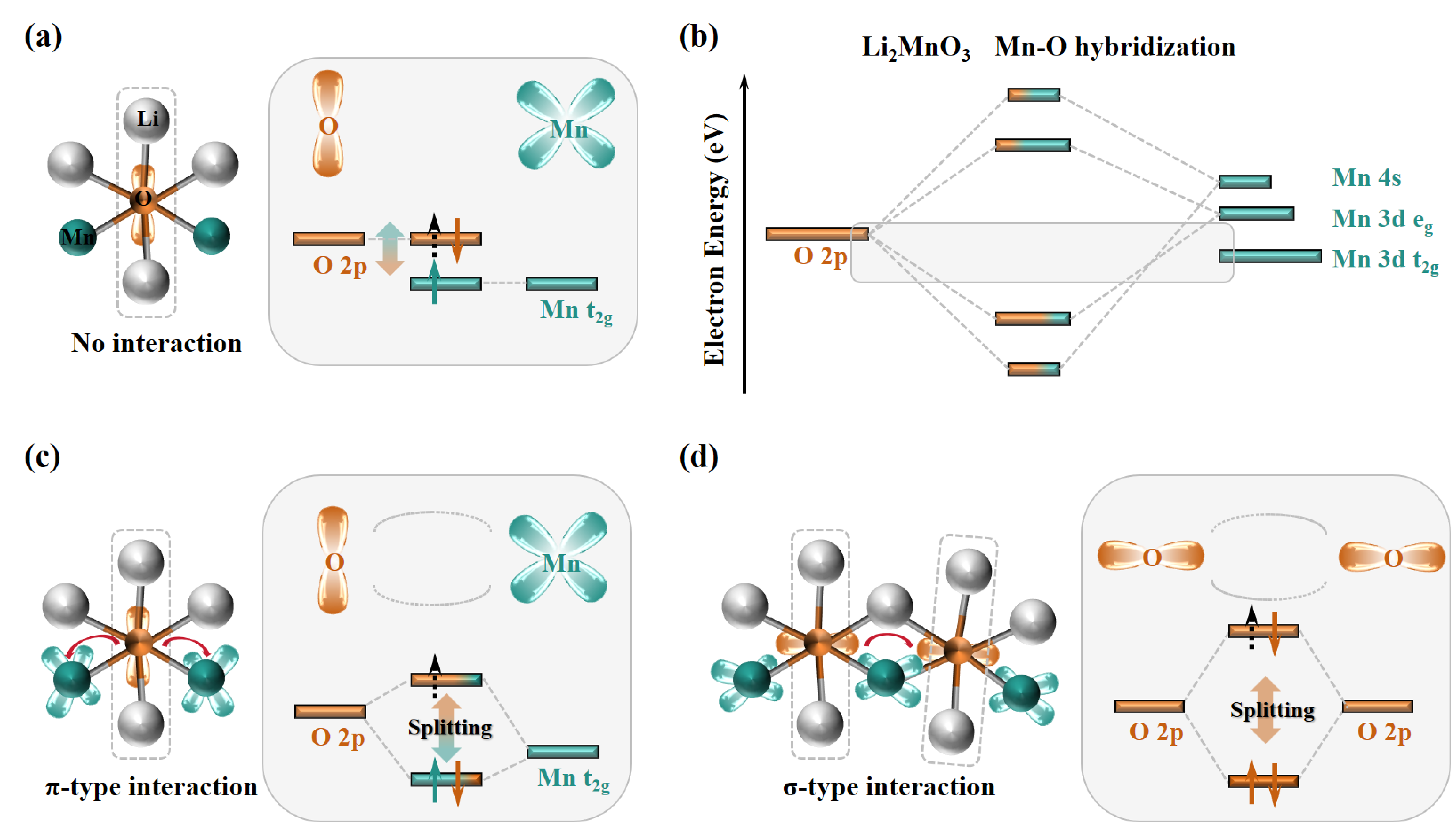 图3. 富锂锰基正极材料中氧氧化时的轨道和相互作用示意图:(a)无相互作用;(b)Mn t2g和O 2p杂化轨道示意图;(c)π型相互作用;(d)σ型相互作用。黑色箭头表示充电过程中从O 2p轨道中提取的电子。