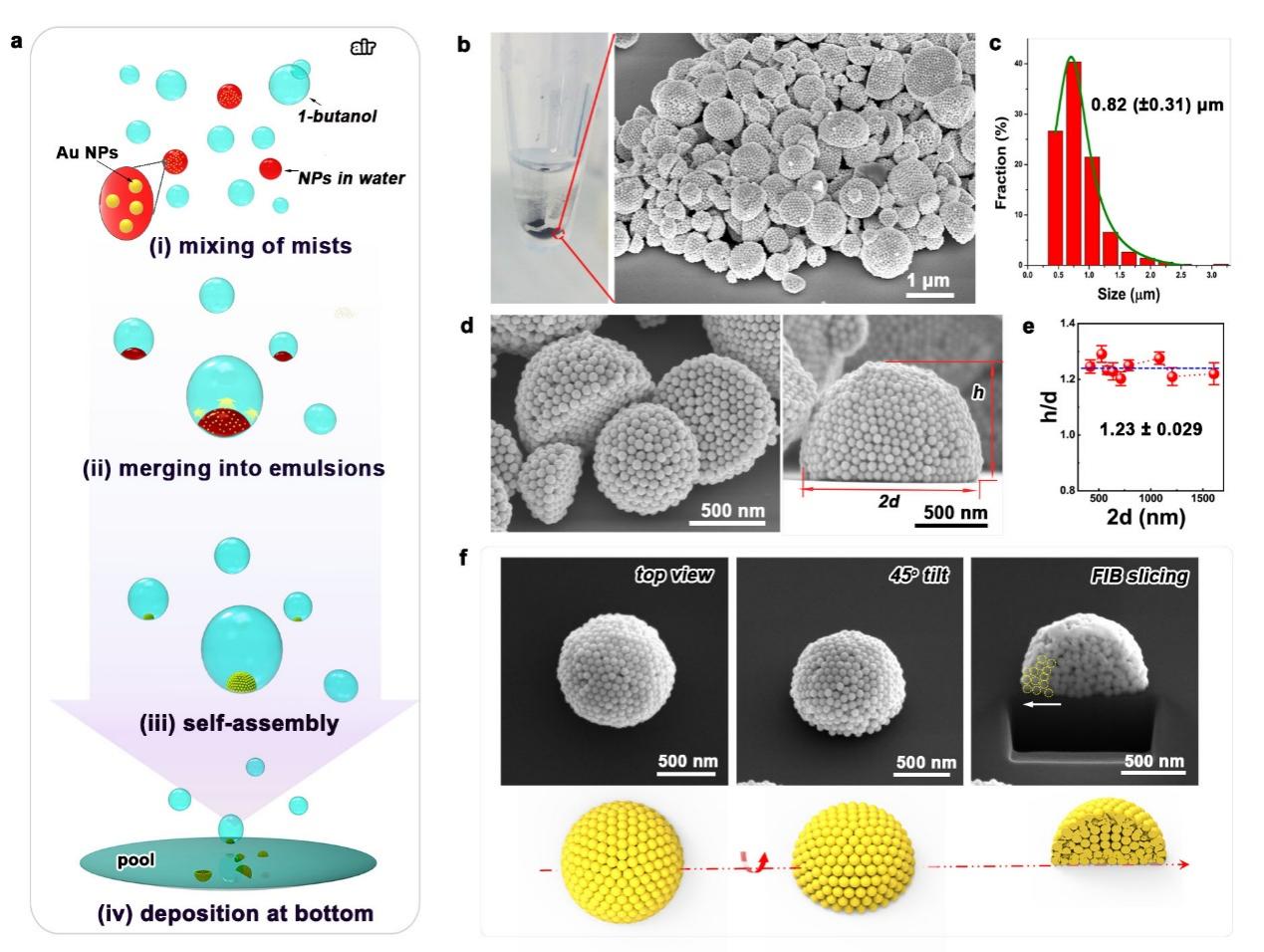 图1. (a) 瞬态乳液气溶胶体系构建及自组装示意图;(b-f)半球形超结构形貌表征。