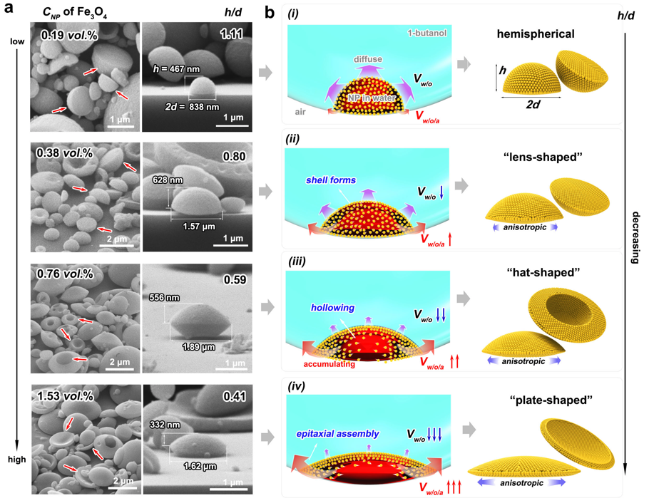 基于该体系,以嵌套的瞬态乳液液滴为模板进行限域自组装,可以制备出传统球形乳液无法实现的各向异性超结构。例如,研究团队成功实现了单分散金纳米粒子有序自组装形成典型的半球形超结构(图1b-1f)。