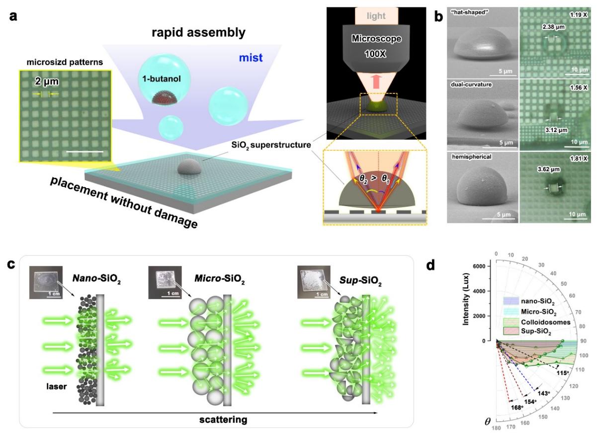 基于这项技术,研究团队成功制备出具有放大倍数可调的二氧化硅微透镜超结构(图3a-3b)。这种新型微透镜可显著提升光通量数值孔径,有望突破传统光学显微镜的分辨率极限;且其独特的可移除特性,使其在珍贵生物样本观测等特殊场景中展现出独特优势。此外,该瞬态乳液气溶胶展现出的连续自组装能力,可直接在基底表面构建富含复杂微米级凹凸结构的涂层(图3c-3d)。这些涂层展现出优异的光扩散性能(低雾度、高亮度),在微型发光二极管显示、光学器件等领域具有广阔应用价值。