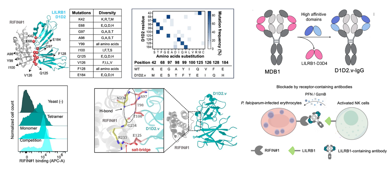 针对这一问题,研究团队运用基于蛋白质结构的亲和力成熟与酵母高通量筛选技术,提出在体外快速开发高亲和力受体嵌合式抗体的新策略,用于开发抑制疟原虫免疫逃逸的高亲和力人工抗体。基于该策略,团队开发出针对恶性疟原虫抗原RIFIN#1 (PF3D7_1254800)的高亲和力LILRB嵌合式抗体D1D2.v-IgG。生化实验显示,与天然型LILRB1相比,D1D2.v-IgG对RIFIN#1的结合亲和力提高了30倍,能够有效阻断LILRB1与RIFIN#1之间的相互作用,且生物稳定性优异。细胞和寄生虫免疫学实验进一步表明,D1D2.v-IgG能够特异性识别K562细胞模型和恶性疟原虫感染红细胞(IEs)表面表达的RIFIN#1抗原,并有效抑制RIFIN#1介导的免疫逃逸。