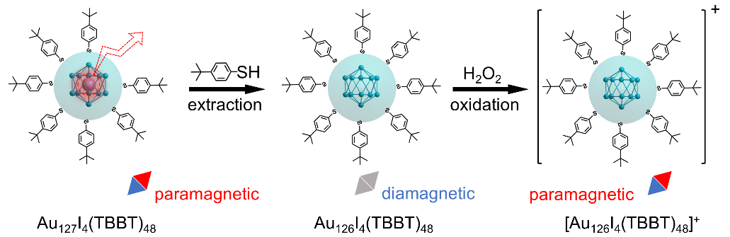 由于固有的热力学不稳定性,具有开壳层电子结构的顺磁性金纳米团簇长期以来在合成上面临重要挑战。针对这一问题,研究团队创新性地提出硫醇-碘离子混合配体保护策略,成功构筑了结构明确的多壳层顺磁性Au127纳米团簇。在维持价态稳定的基础上,精确移除单个中心金原子,实施了Au127纳米团簇的“摘心术”,从而对团簇磁学特性进行了定向调控。