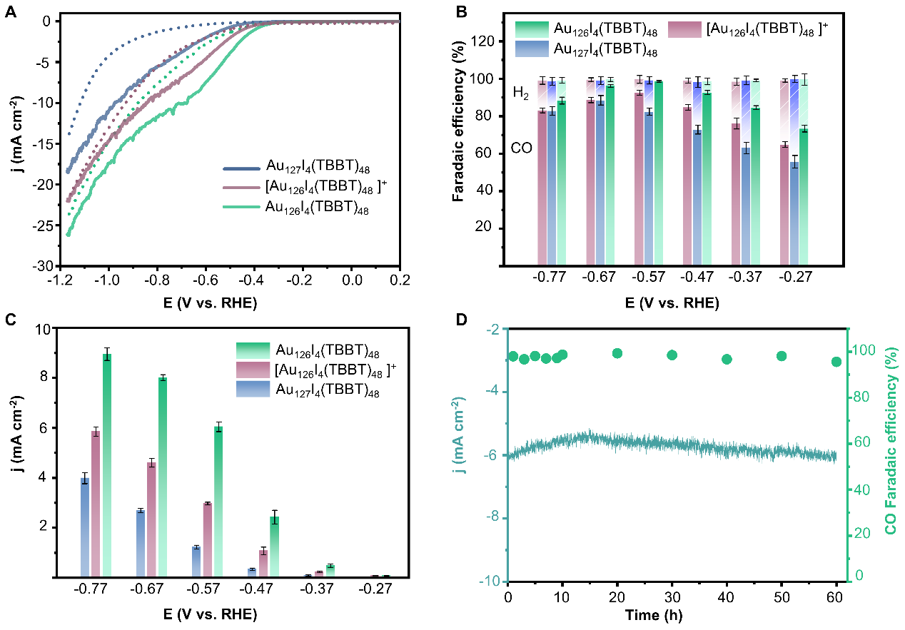 图4. Au127、Au126和[Au126]+的电催化CO2还原性能测试。