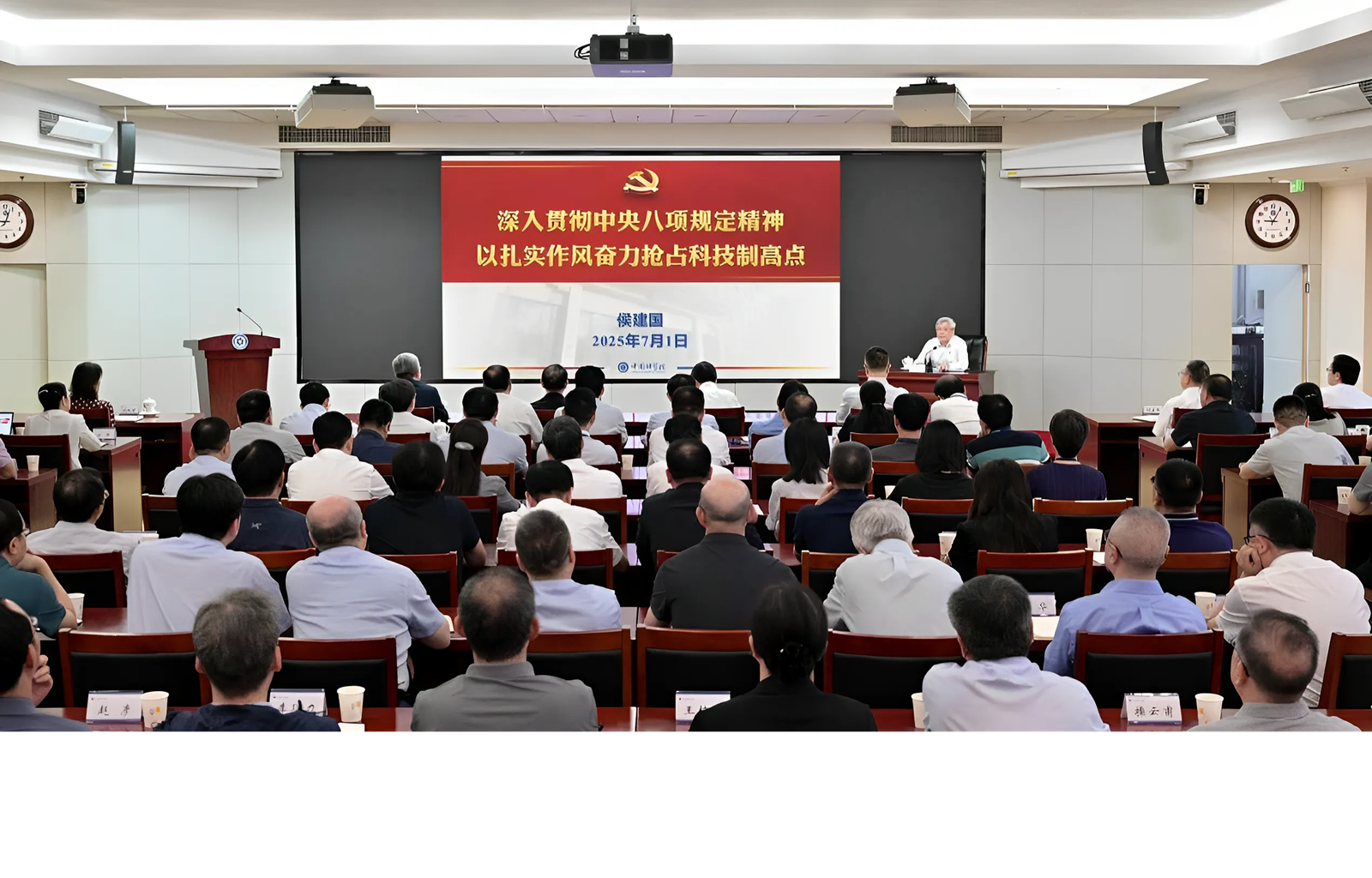 7月1日,在中国共产党成立104周年之际,中国科学院召开专题党课报告会。中国科学院院长、党组书记侯建国以《深入贯彻中央八项规定精神 以扎实作风奋力抢占科技制高点》为题作党课报告,副院长、党组副书记吴朝晖主持报告会。侯建国指...