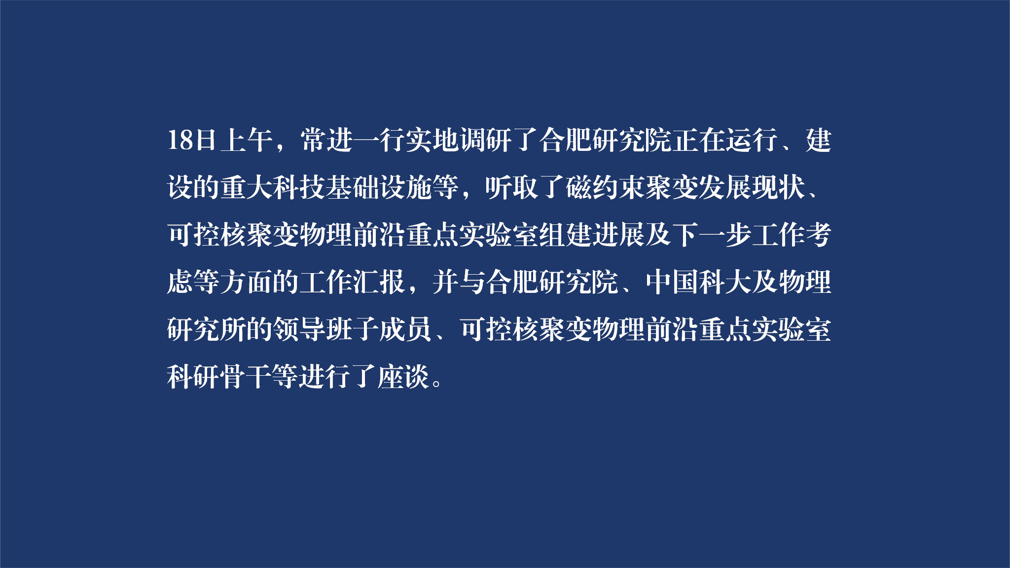1月18日至19日,中国科学院副院长、党组成员常进到中国科学院合肥物质科学研究院和中国科学技术大学开展调研。18日上午,常进一行实地调研了合肥研究院正在运行、建设的重大科技基础设施等,听取了磁约束聚变发展现状、可控核聚变物理...