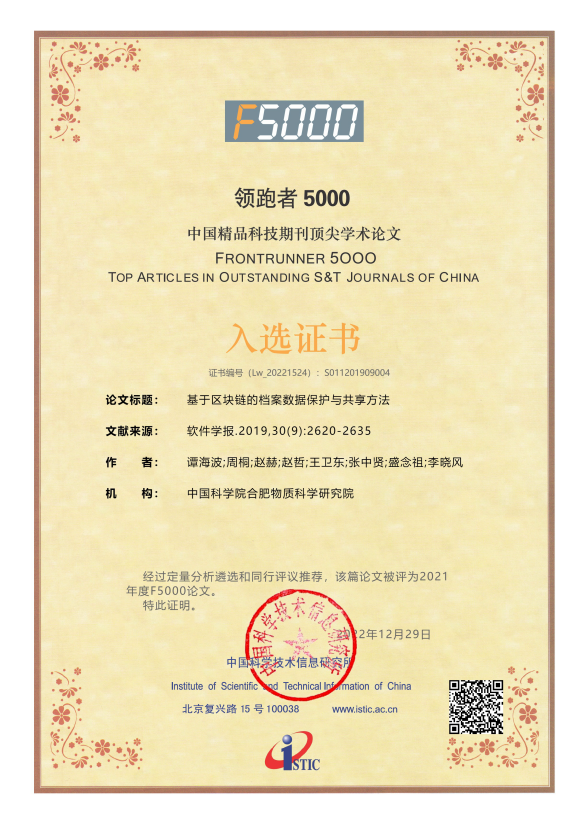 近日,信息中心团队发表于《软件学报》的论文《基于区块链的档案数据保护与共享方法》,被评选为“领跑者5000-中国精品科技期刊顶尖学术论文(F5000)”。