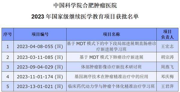 近日,全国继续医学教育委员会办公室发布《关于公布2023年第一批国家级继续医学教育项目的通知》,中国科学院合肥肿瘤医院5个项目荣获国家级继续医学教育项目立项,获批项目数创医院历史新高。