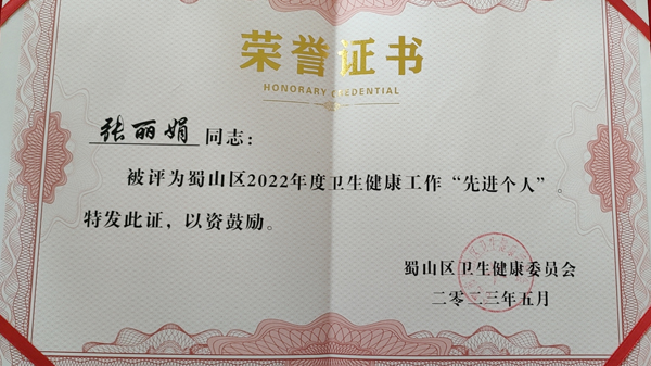 5月12日上午,合肥蜀山区卫健委组织召开纪念“5.12”护士节暨表扬大会,中国科学院合肥肿瘤医院、蜀山经济技术开发区井岗镇社区卫生服务中心分别荣获“2022年度蜀山区卫生健康工作先进集体”,医院职工张丽娟荣获“2022年度蜀山区卫生健康工作先进个人”称号。