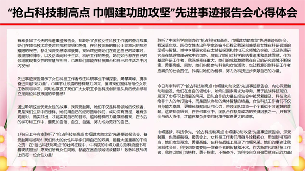 固体所组织女职工聆听了中国科学院妇工委、工会女工委举办的“抢占科技制高点 巾帼建功助攻坚”先进事迹报告会。全国三八红旗手、全国巾帼文明岗等获奖代表分享了她们攻坚克难、勇攀高峰的科研故事,展现了女性科技工作者的巾帼之力与巾帼之美。固体所女职工深受鼓舞,纷纷表示要以实际行动在科研岗位上发光发热,为国家科技事业添砖加瓦。