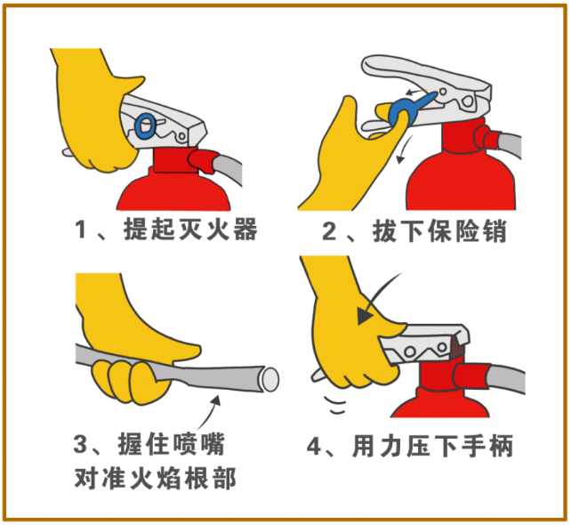 普通干粉灭火器的使用方法:提、拔、握、压。
