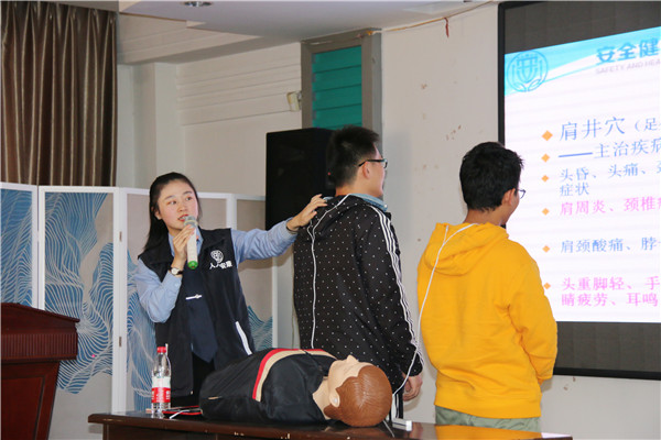 动,给大家讲解了人工呼吸、胸外按压、经络穴位养生、职业病的防治、心理健康、雾霾天气的危害及健