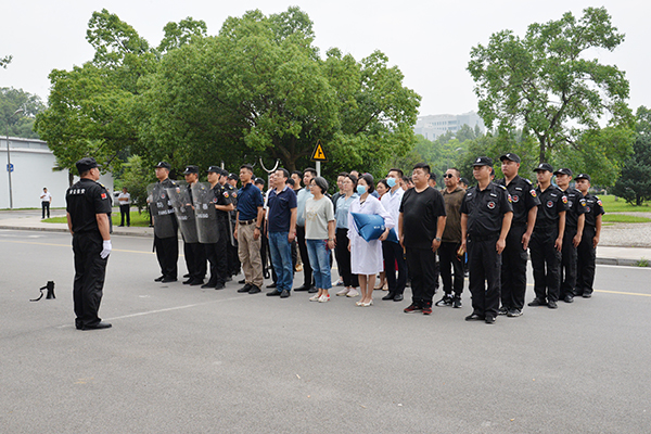 本次演练由合肥研究院安全保密处联合井岗派出所和安信保安公司组织,井岗派出所科学岛警务站负责人王圣前参加演练,井岗派出所副所长贺开兵现场指导,安全保密处处长谭立青担任现场指挥。演练设置了反恐防暴器材展示、长警棍术展示和警棍盾牌术展示环节,并模拟了恐怖分子实施恐怖活动的应急事件。应急处置环节,三名社会闲杂涉恐人员携带爆炸物,驱车强闯南门道闸,安保处接到报告后,立即向分管领导报告并报警。分管领导研判后立即下达了启动反恐防暴处置预案的命令,各单元迅速响应,采取了行之有效的应对措施,最终顺利将三名恐怖分子擒获并移交警方。演练中,巡逻组、警戒组、疏导组、救护组、防暴组有序配合,顺利完成全过程应急处置工作。