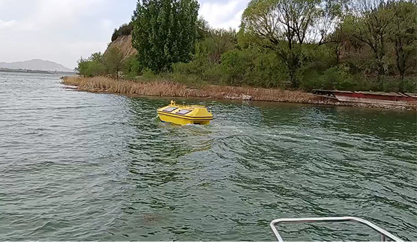 无人自航式水质监测船进行水上作业