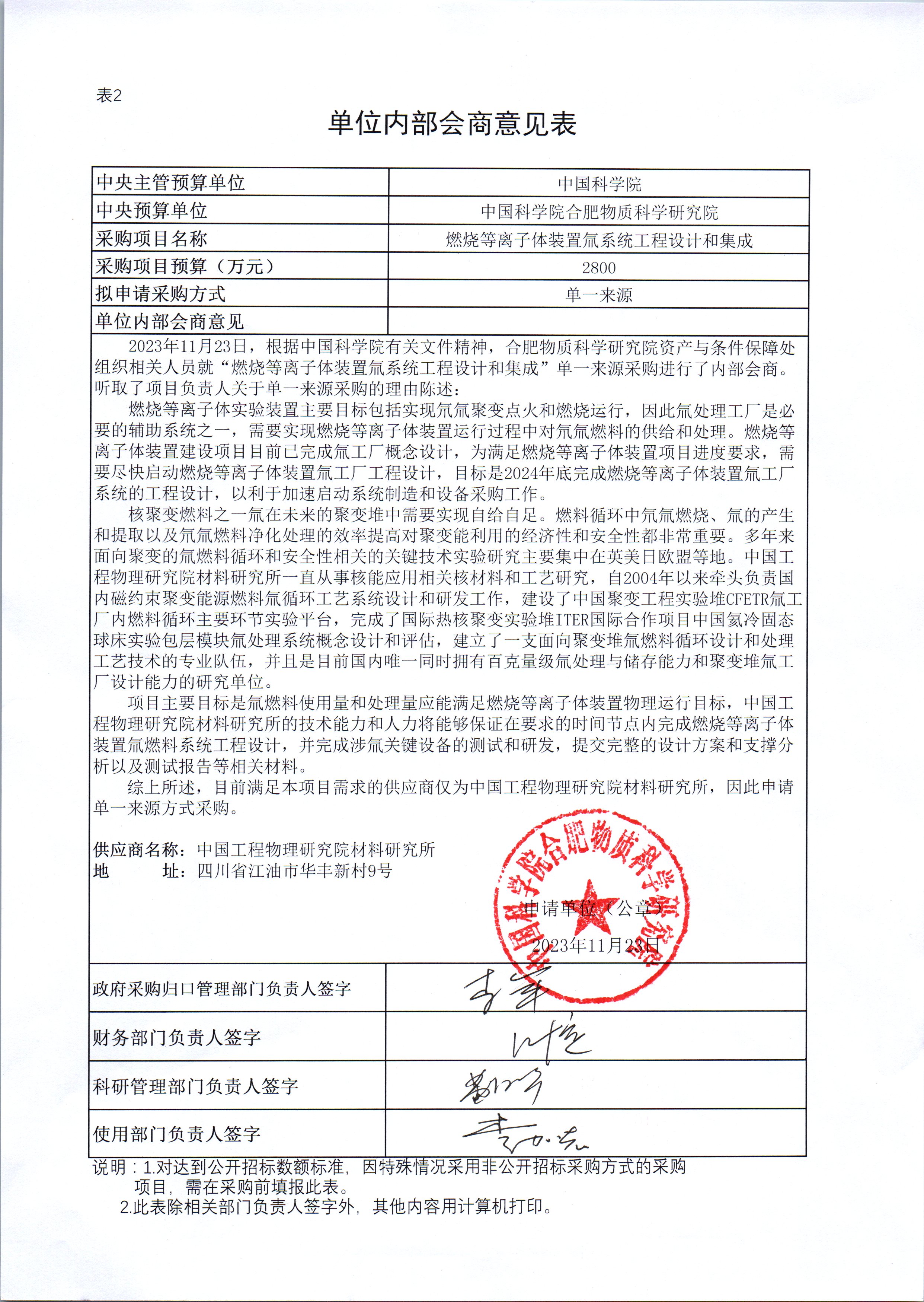 [公示已结束]关于《燃烧等离子体装置氚系统工程设计和集成》采用单一来源采购方式的单位内部会商意见的公示(2023.11.24-2023.11.30)