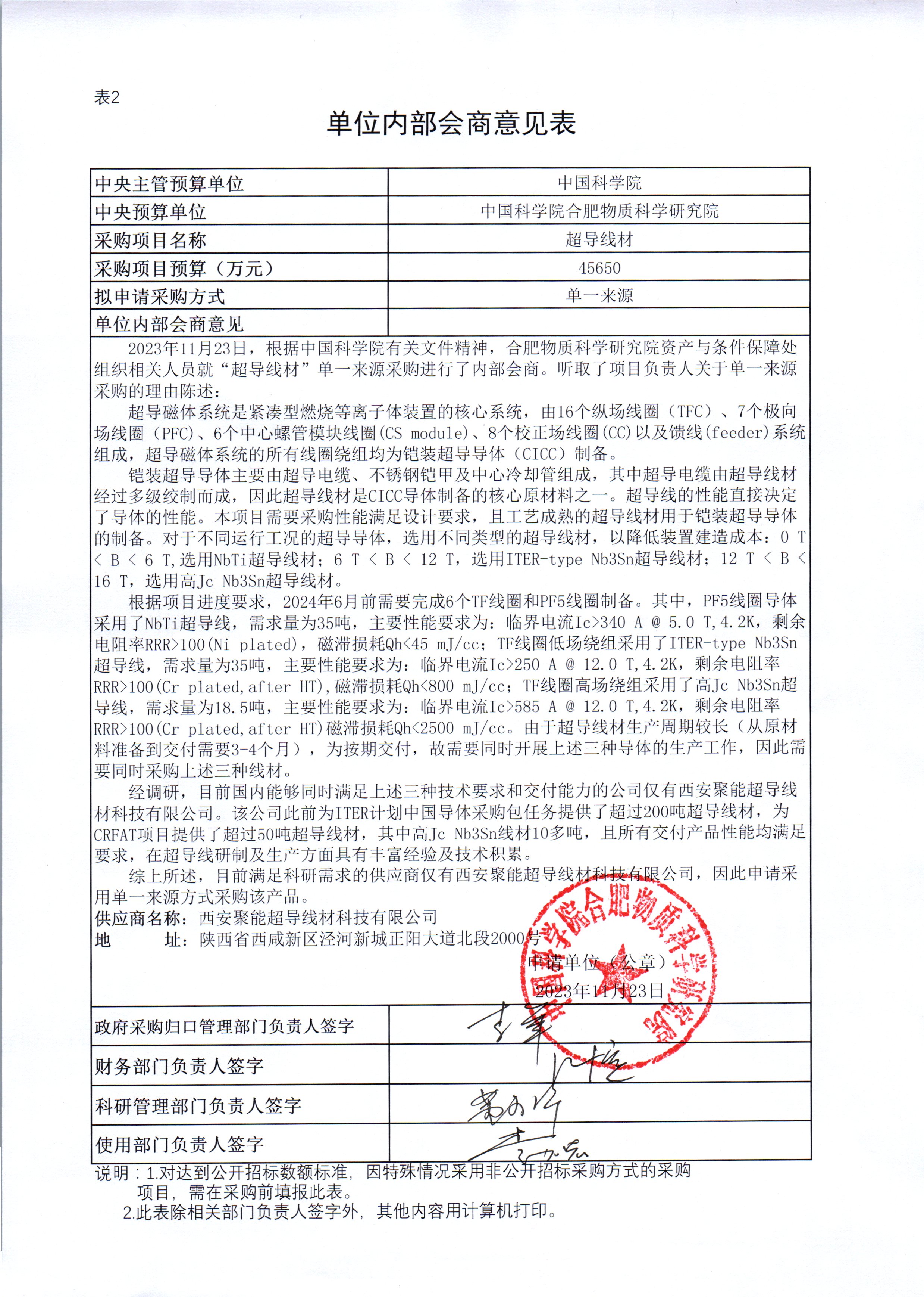 [公示已结束]关于《超导线材》采用单一来源采购方式的单位内部会商意见的公示(2023.11.24-2023.11.30)