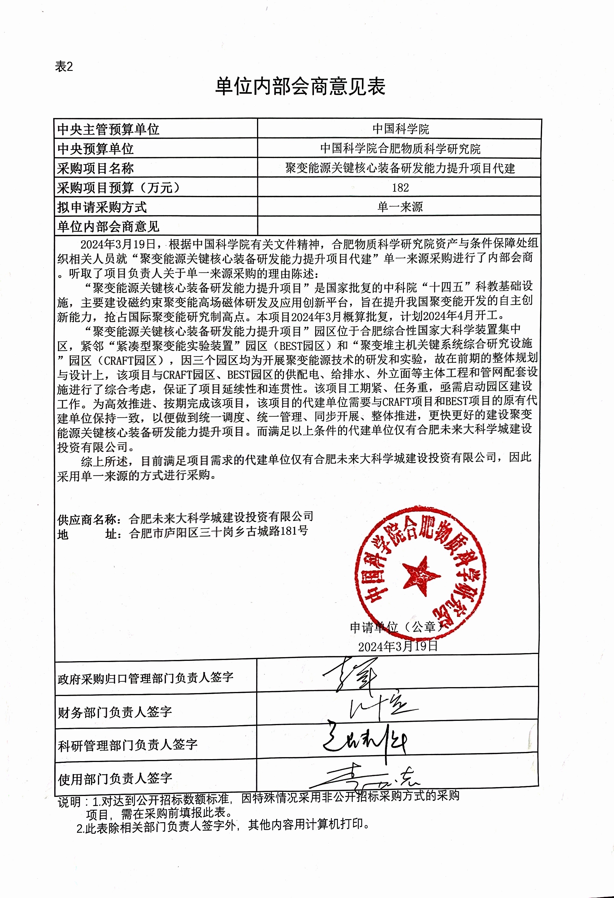 [公示已结束]关于《聚变能源关键核心装备研发能力提升项目代建》采用单一来源采购方式的单位内部会商意见的公示(2024.3.25-2024.4.1)