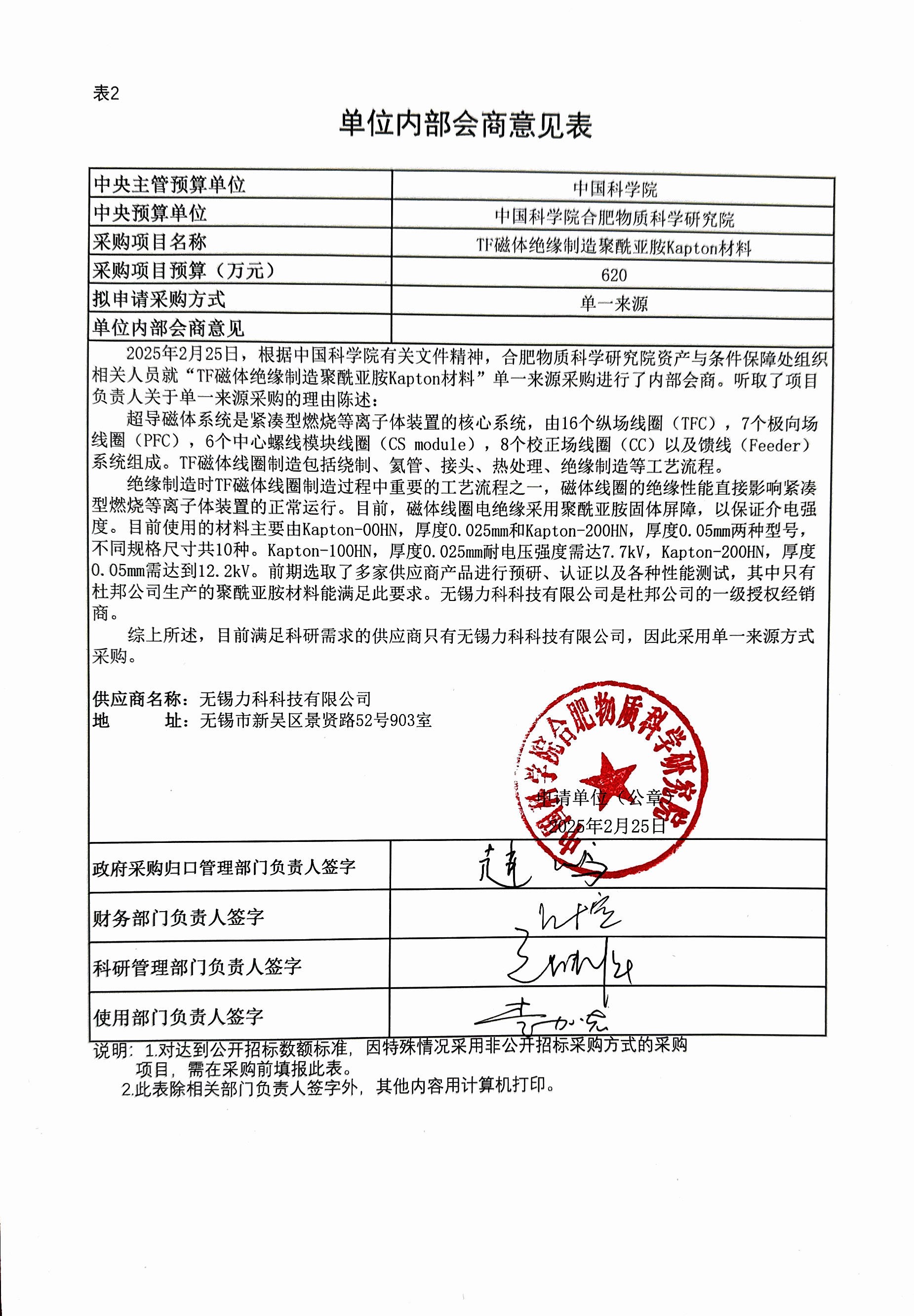 [公示已结束]关于《TF绝缘材料聚酰亚胺Kapton材料》采用单一来源采购方式的单位内部会商意见的公示(2025.3.4-2025.3.11)