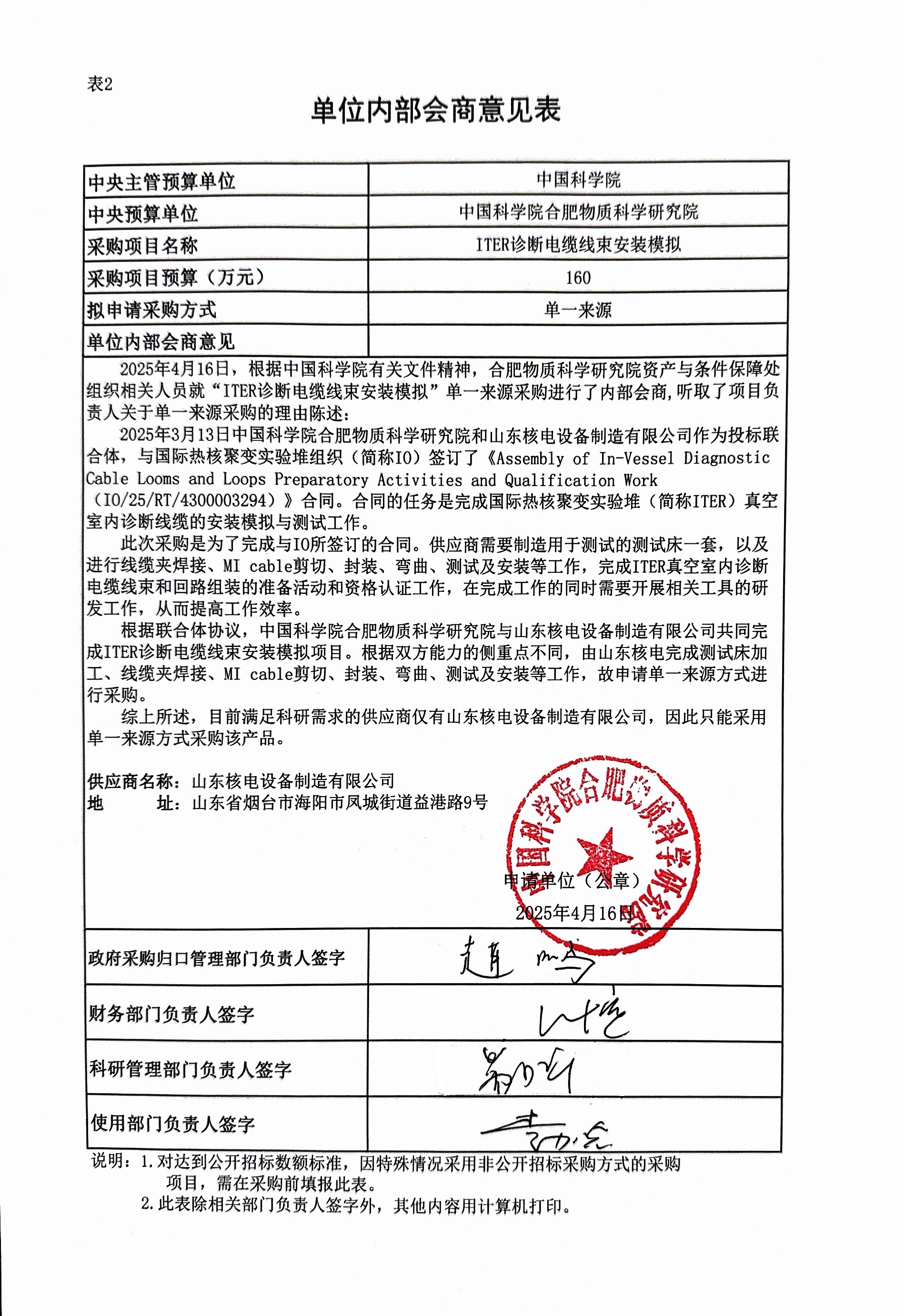 [公示已结束]关于《ITER诊断电缆线束安装模拟》采用单一来源采购方式的单位内部会商意见的公示(2025.4.28-2025.5.7)