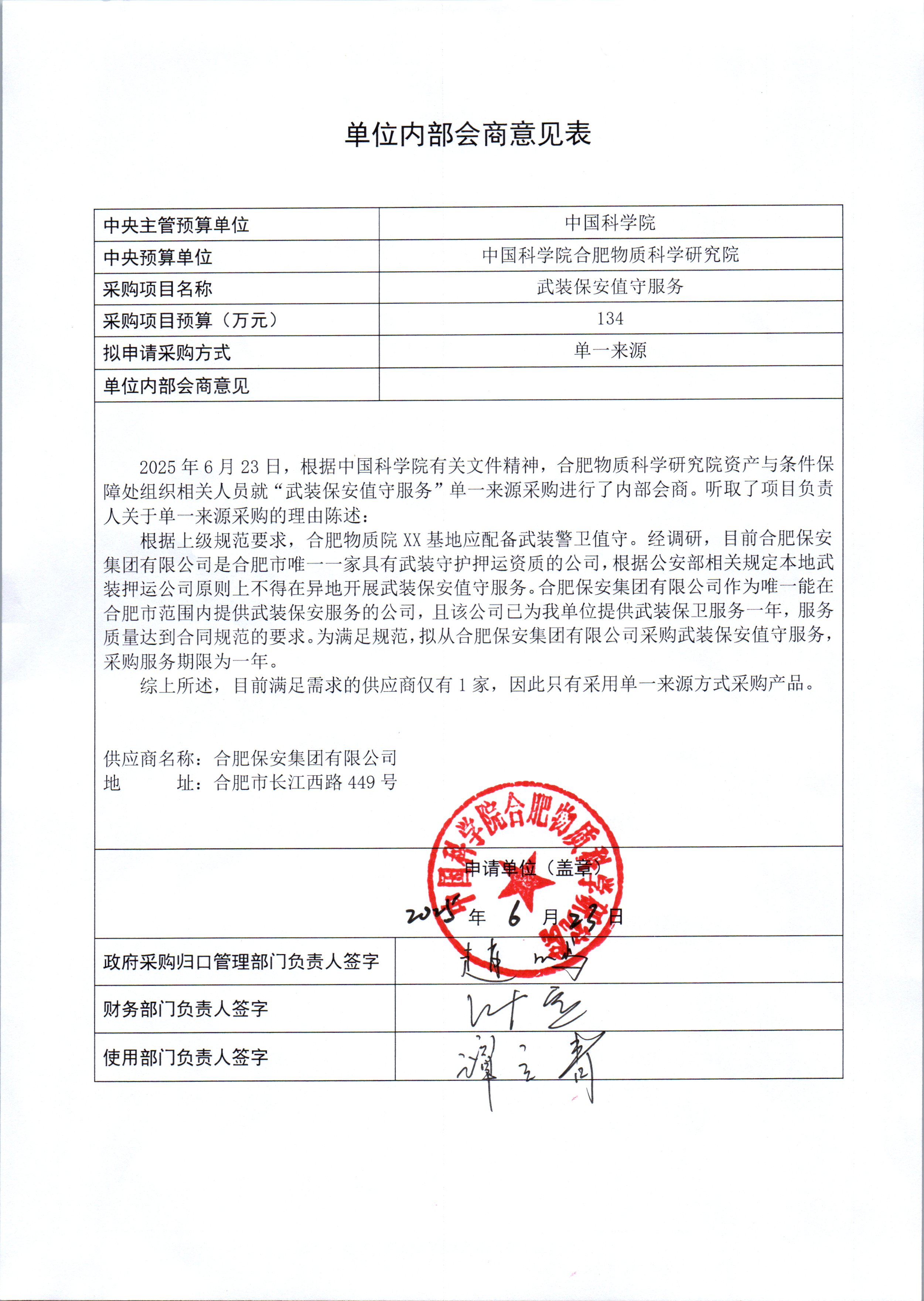 [公示已结束]关于《武装保安值守服务》采用单一来源采购方式的单位内部会商意见的公示(2025.6.23-2025.6.30)