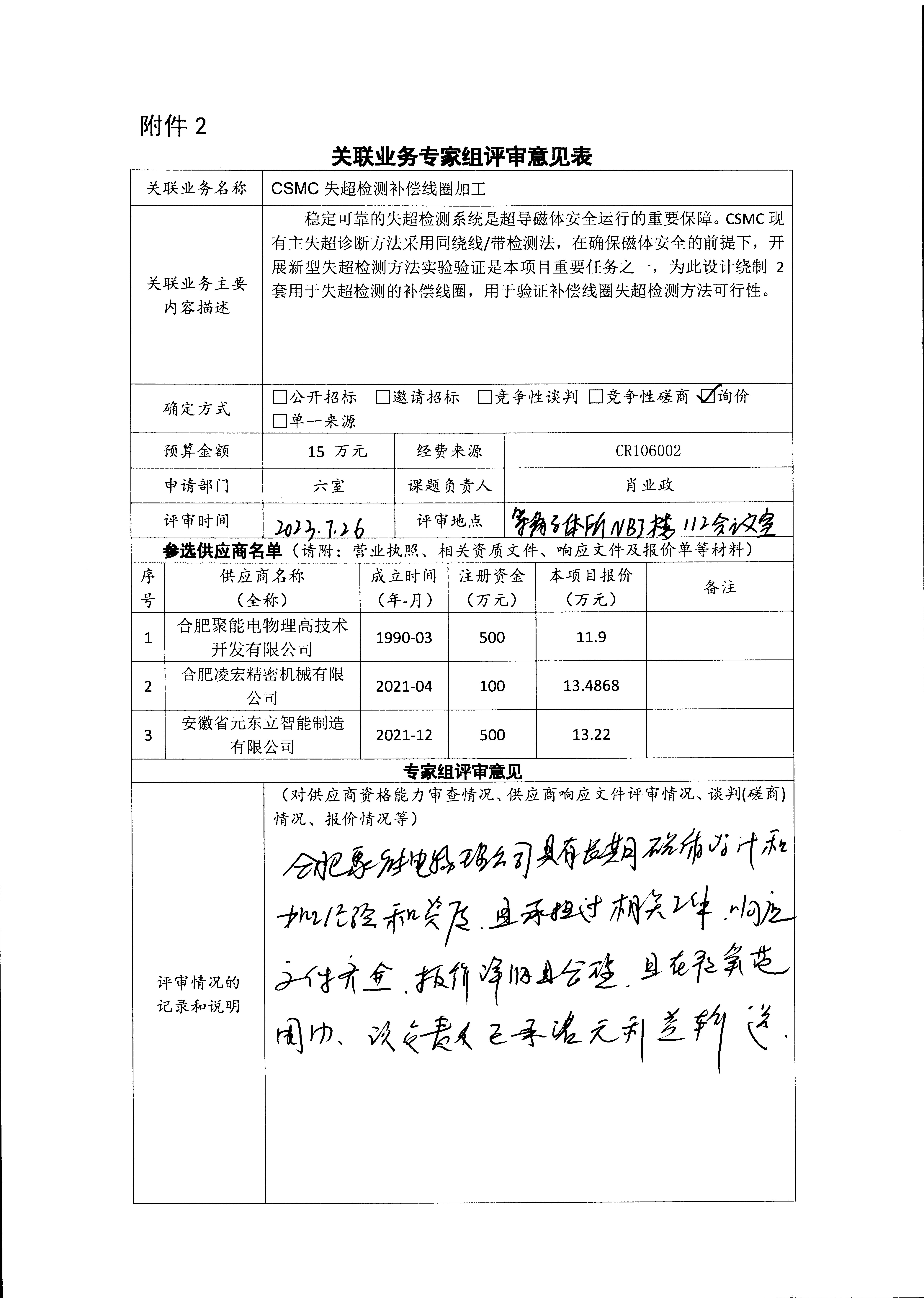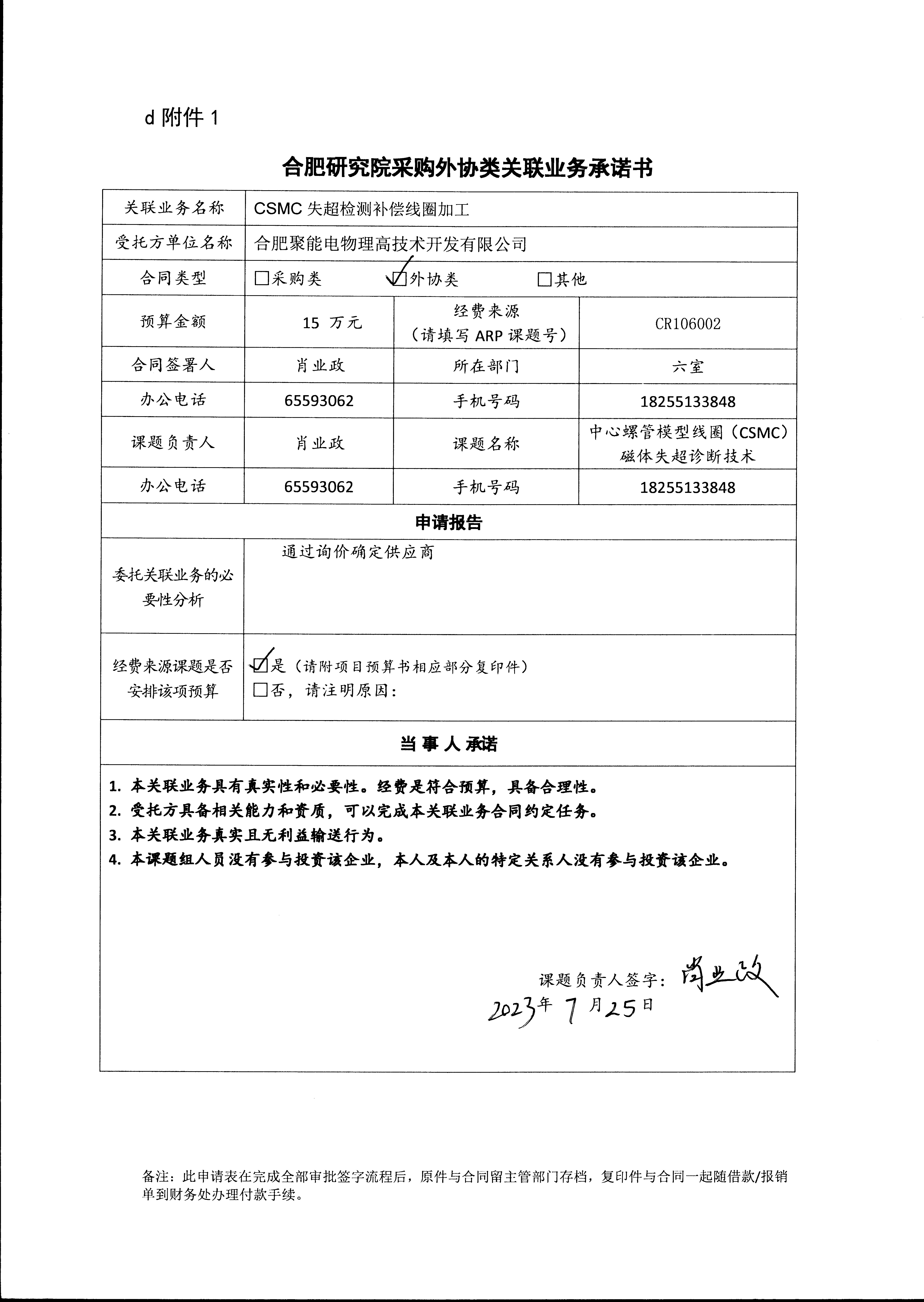 根据《中国科学院关于加强科研项目关联业务管理的暂行规定》(科发条财字〔2015〕125号)、《中国科学院合肥物质科学研究院关于加强科研项目关联业务管理的实施细则》(科合院发资字〔2021〕8号)、《合肥研究院加强关联业务管理暂行办法》(科合院发资字〔2022〕1号)要求,现就我院委托合肥聚能电物理高技术开发有限公司进行CSMC失超检测补偿线圈加工服务项目进行关联业务公示。