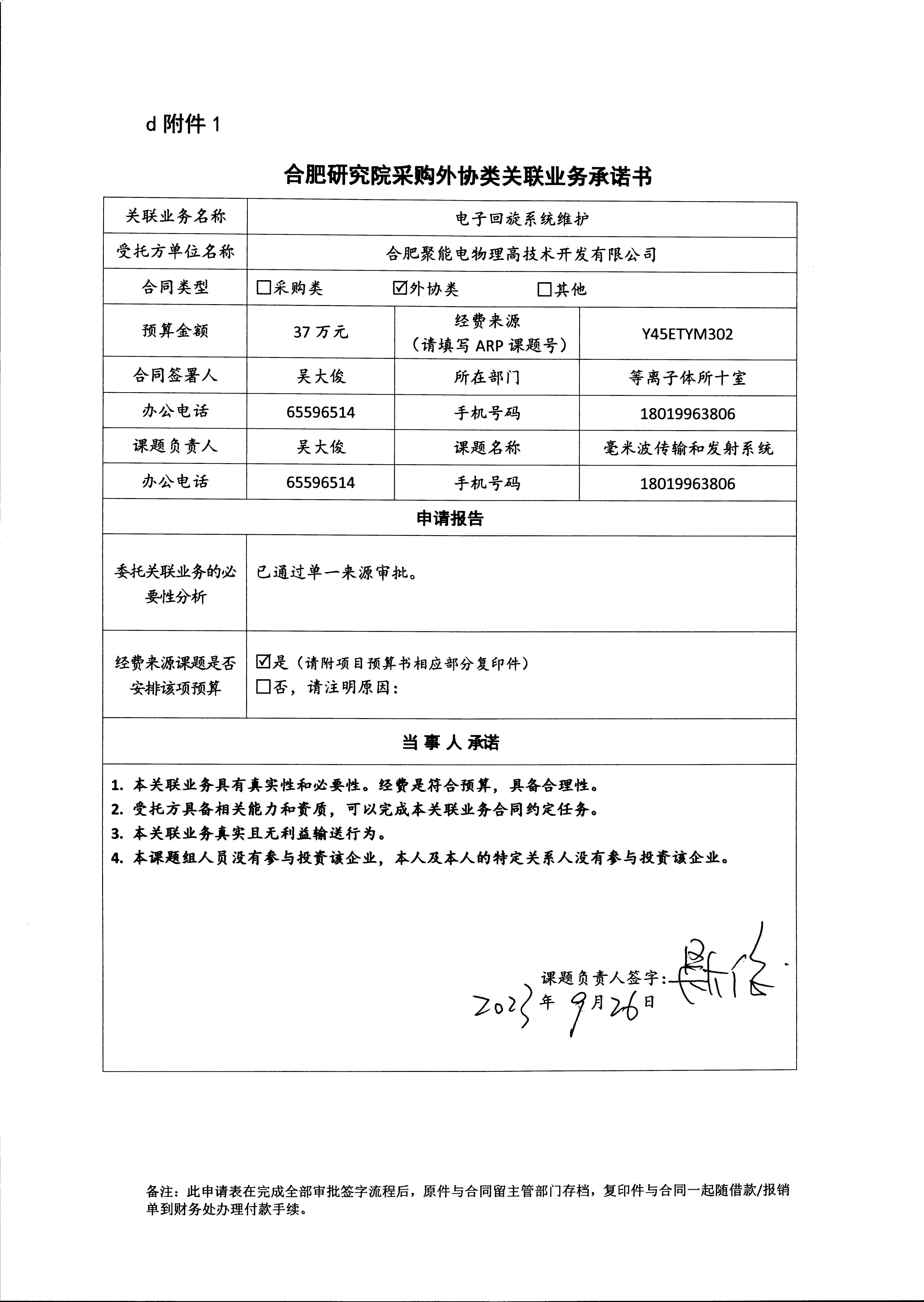 根据《中国科学院关于加强科研项目关联业务管理的暂行规定》(科发条财字〔2015〕125号)、《中国科学院合肥物质科学研究院关于加强科研项目关联业务管理的实施细则》(科合院发资字〔2021〕8号)、《合肥研究院加强关联业务管理暂行办法》(科合院发资字〔2022〕1号)要求,现就我院委托合肥聚能电物理高技术开发有限公司进行电子回旋系统维护项目进行关联业务公示。