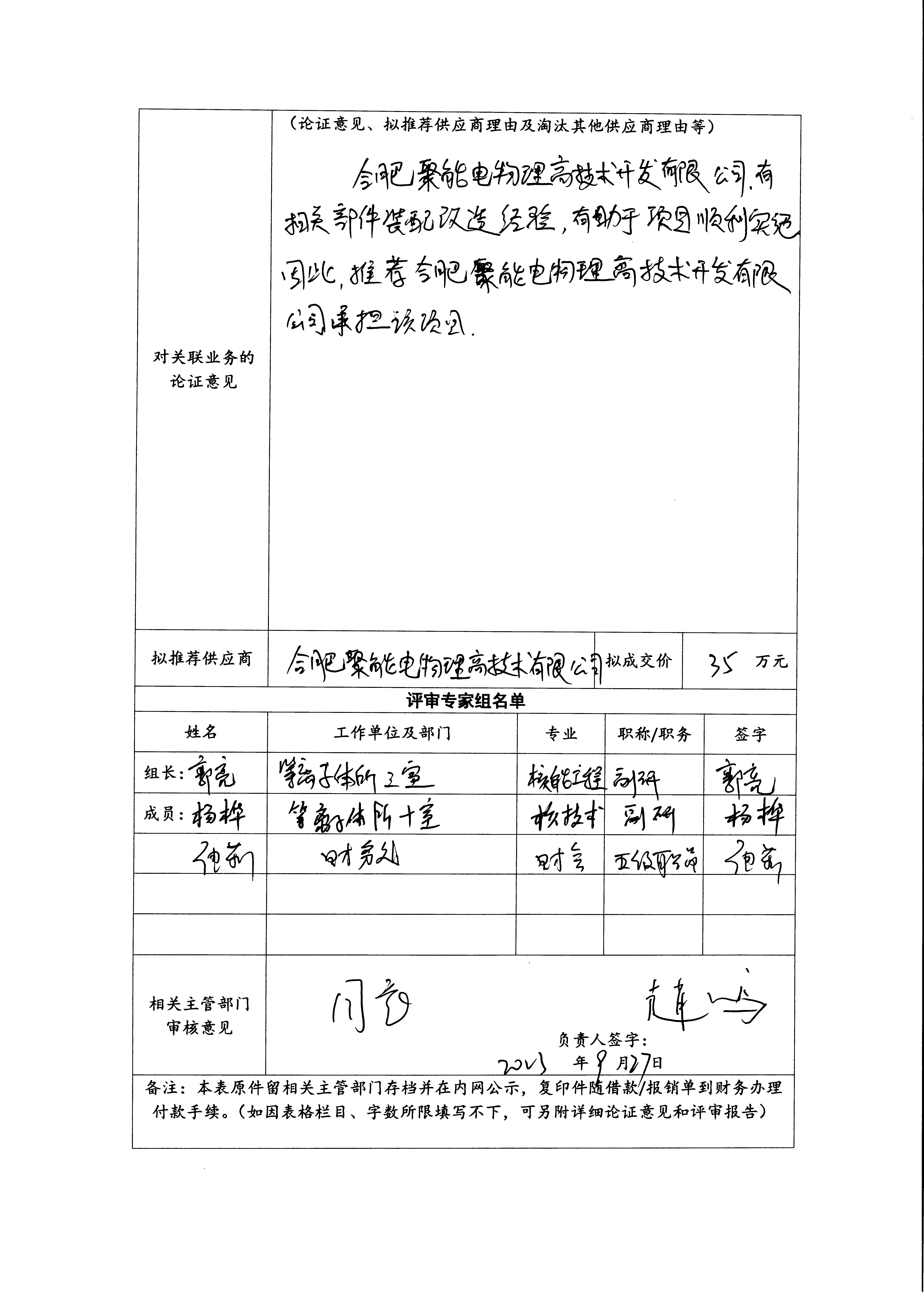 [公示已结束]中国科学院合肥物质科学研究院 关于委托合肥聚能电物理高技术开发有限公司进行电子回旋系统维护的关联业务公示