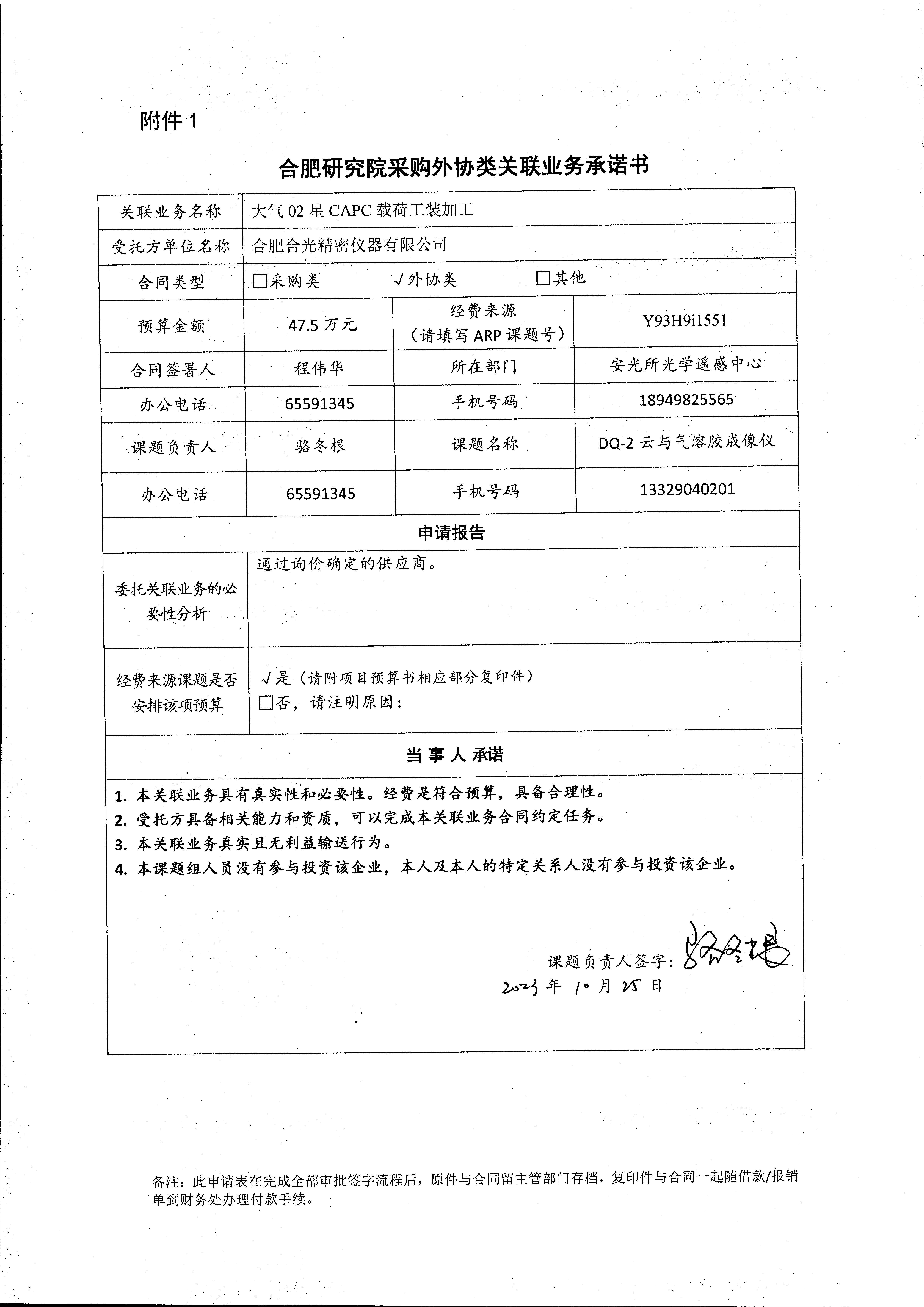 中国科学院合肥物质科学研究院光学精密机械研究所骆冬根老师,委托合肥合光精密仪器有限公司进行大气02星CAPC载荷工装加工,该批加工件包含载荷装调系统结构件加工、地检设备结构件加工、辅助测试及技术验证结构件加工、力学试验工装加工及加工件检测等。合肥科学岛控股公司持有合肥合光精密仪器有限公司100%的股份,本次采购构成关联业务交易。