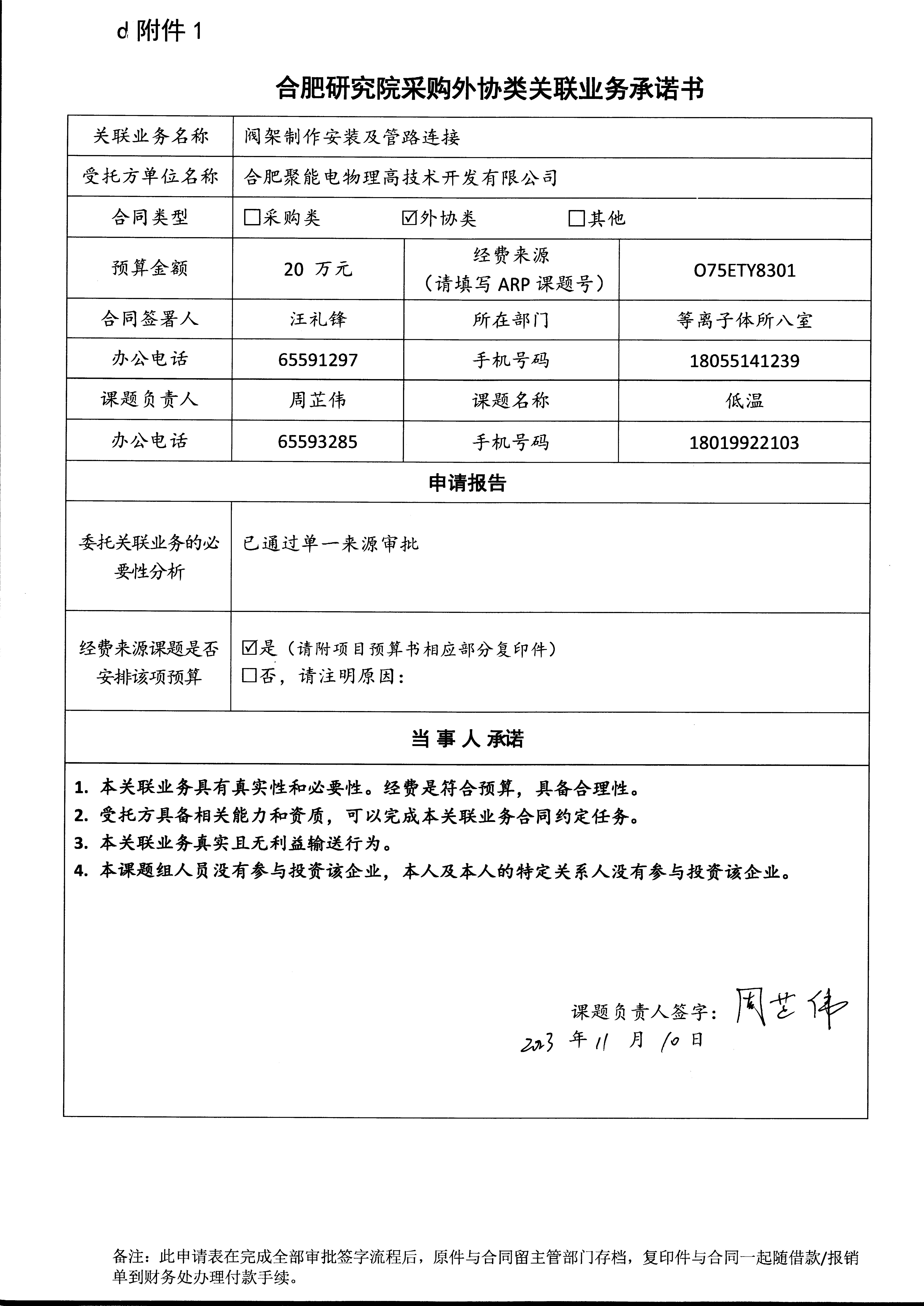 中国科学院合肥物质科学研究院等离子体物理研究所周芷伟老师委托合肥聚能电物理高技术开发有限公司进行阀架制作安装及管路连接。内容包含:制作8-4西面储气系统收、补气阀架,现场安装阀架并制作彩钢顶棚,连接自动阀门和手动阀门,从8—5引出 32管路空气源管路进行连接,更换8、9号筒的失超保护阀、和原有收、补气管路进行连接等外协业务。该外协业务主要用于EAST实验氦气供给的操作,使原来必须到现场的操作变成可以计算机远程操作。便于监控,氦气供给的切换更安全、可靠。合肥聚能电物理高技术开发有限公司自然人股东包括合肥科学岛控股有限公司,占该公司35%的股份,本次构成关联业务交易。