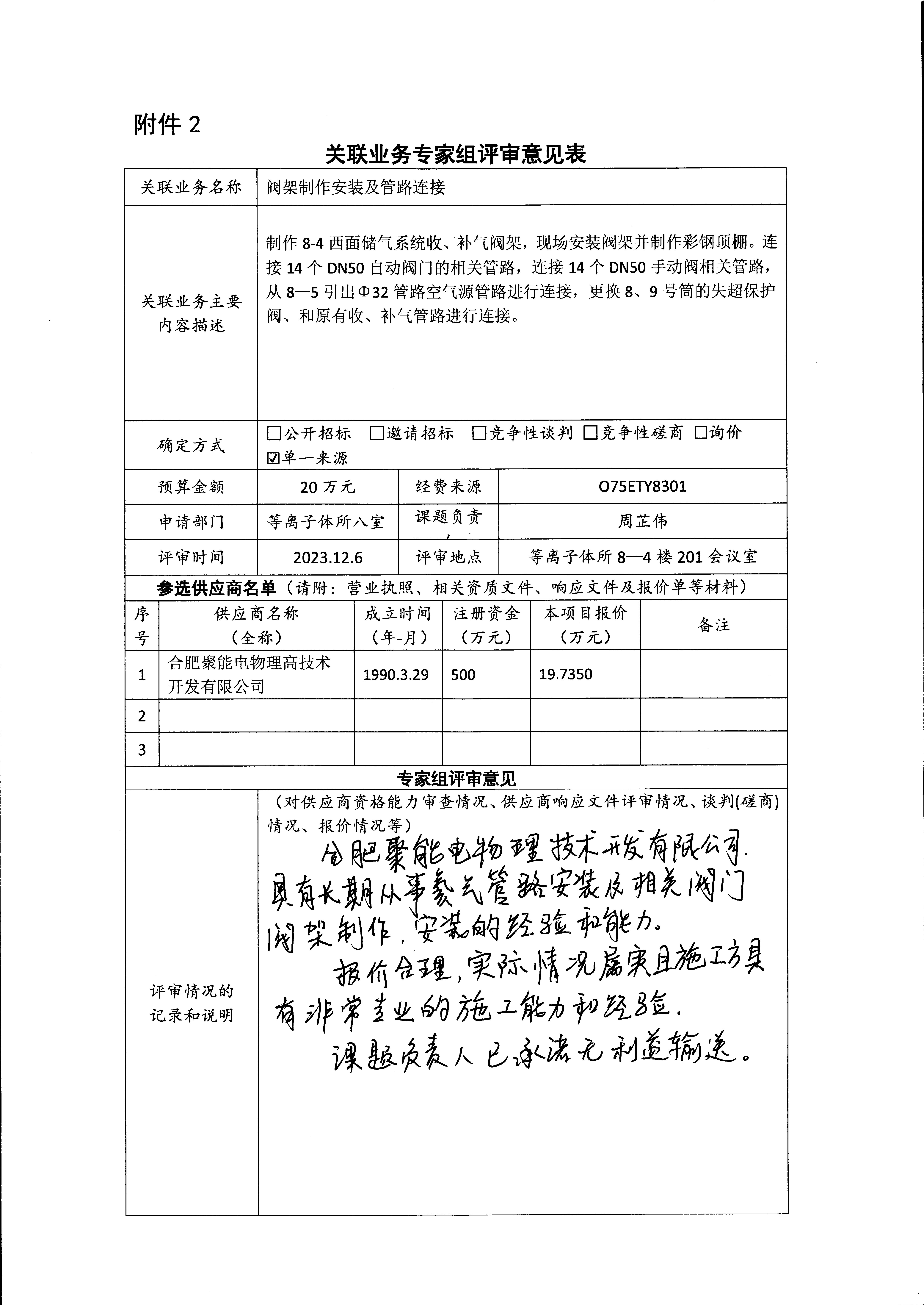 根据《中国科学院关于加强科研项目关联业务管理的暂行规定》(科发条财字〔2015〕125号)、《中国科学院合肥物质科学研究院关于加强科研项目关联业务管理的实施细则》(科合院发资字〔2021〕8号)、《合肥研究院加强关联业务管理暂行办法》(科合院发资字〔2022〕1号)要求,现就我院委托合肥聚能电物理高技术开发有限公司进行阀架制作安装及管路连接的关联业务进行公示。