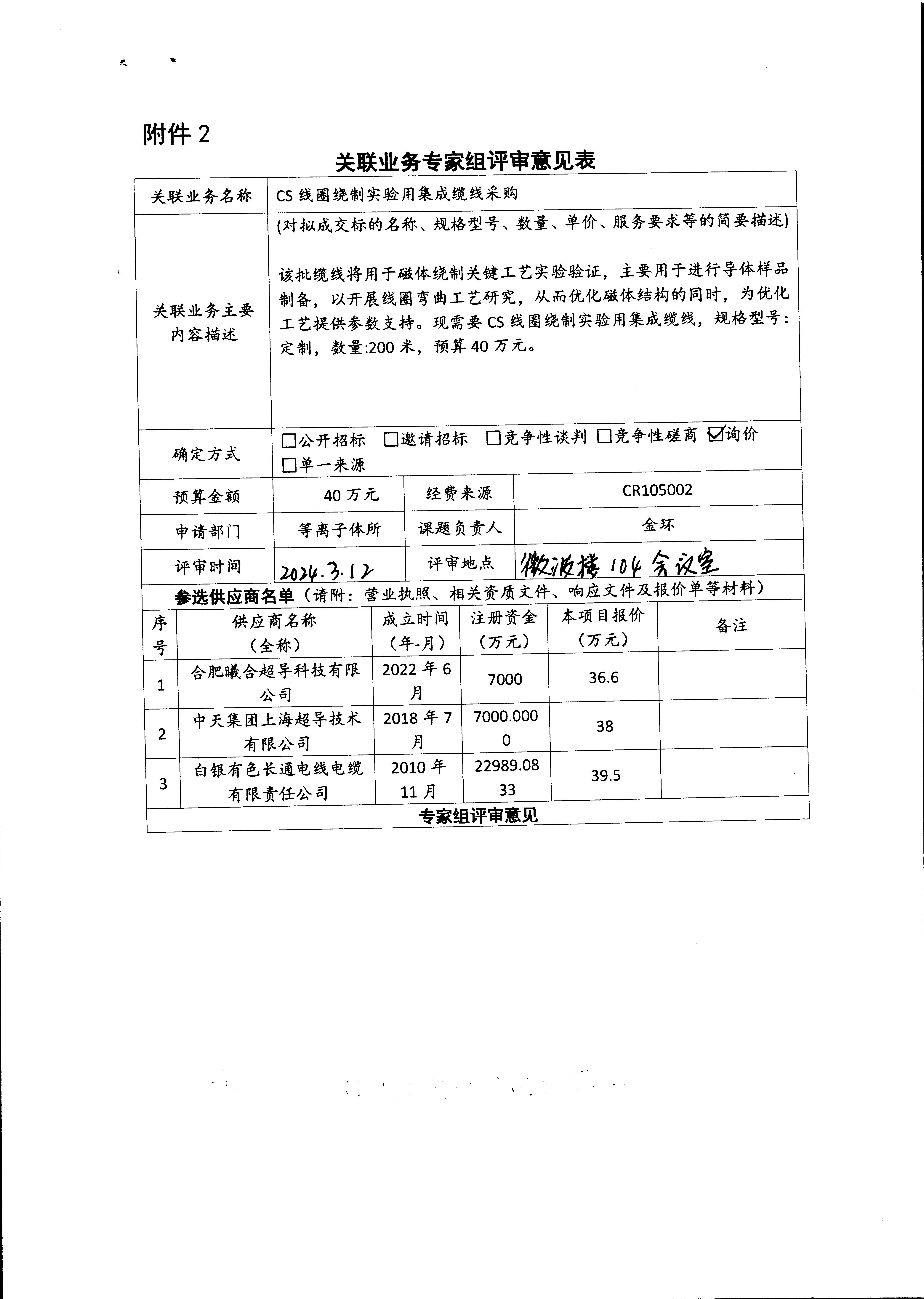 根据《中国科学院关于加强科研项目关联业务管理的暂行规定》(科发条财字〔2015〕125号)、《中国科学院合肥物质科学研究院关于加强科研项目关联业务管理的实施细则》(科合院发资字〔2021〕8号)、《合肥研究院加强关联业务管理暂行办法》(科合院发资字〔2022〕1号)要求,现就我院向合肥曦合超导科技有限公司购买CS线圈绕制实验用集成缆线的关联业务进行公示。