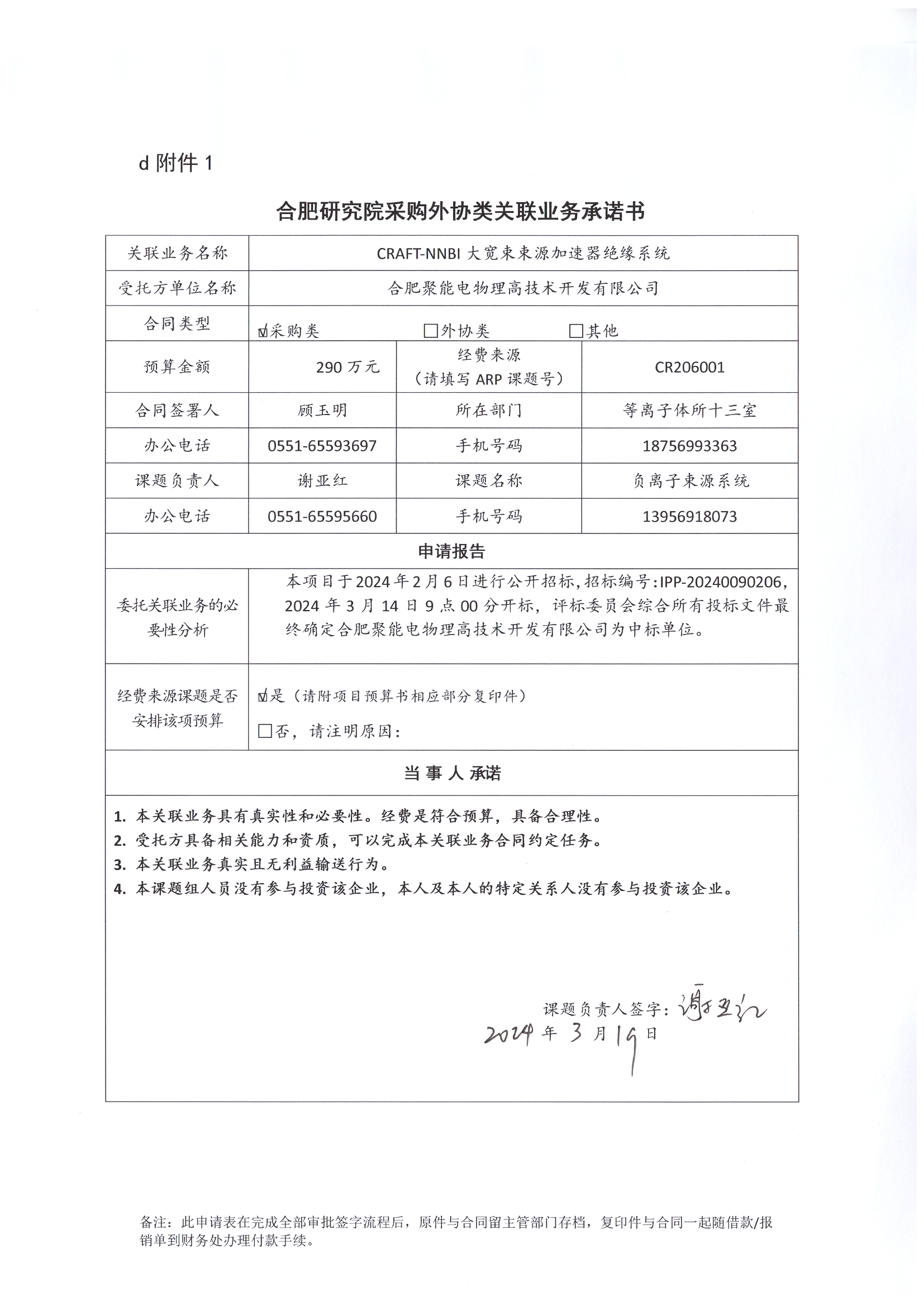 根据《中国科学院关于加强科研项目关联业务管理的暂行规定》(科发条财字〔2015〕125号)、《中国科学院合肥物质科学研究院关于加强科研项目关联业务管理的实施细则》(科合院发资字〔2021〕8号)、《合肥研究院加强关联业务管理暂行办法》(科合院发资字〔2022〕1号)要求,现就我院委托合肥聚能电物理高技术开发有限公司加工CRAFT-NNBI大宽束束源加速器绝缘系统的关联业务进行公示。