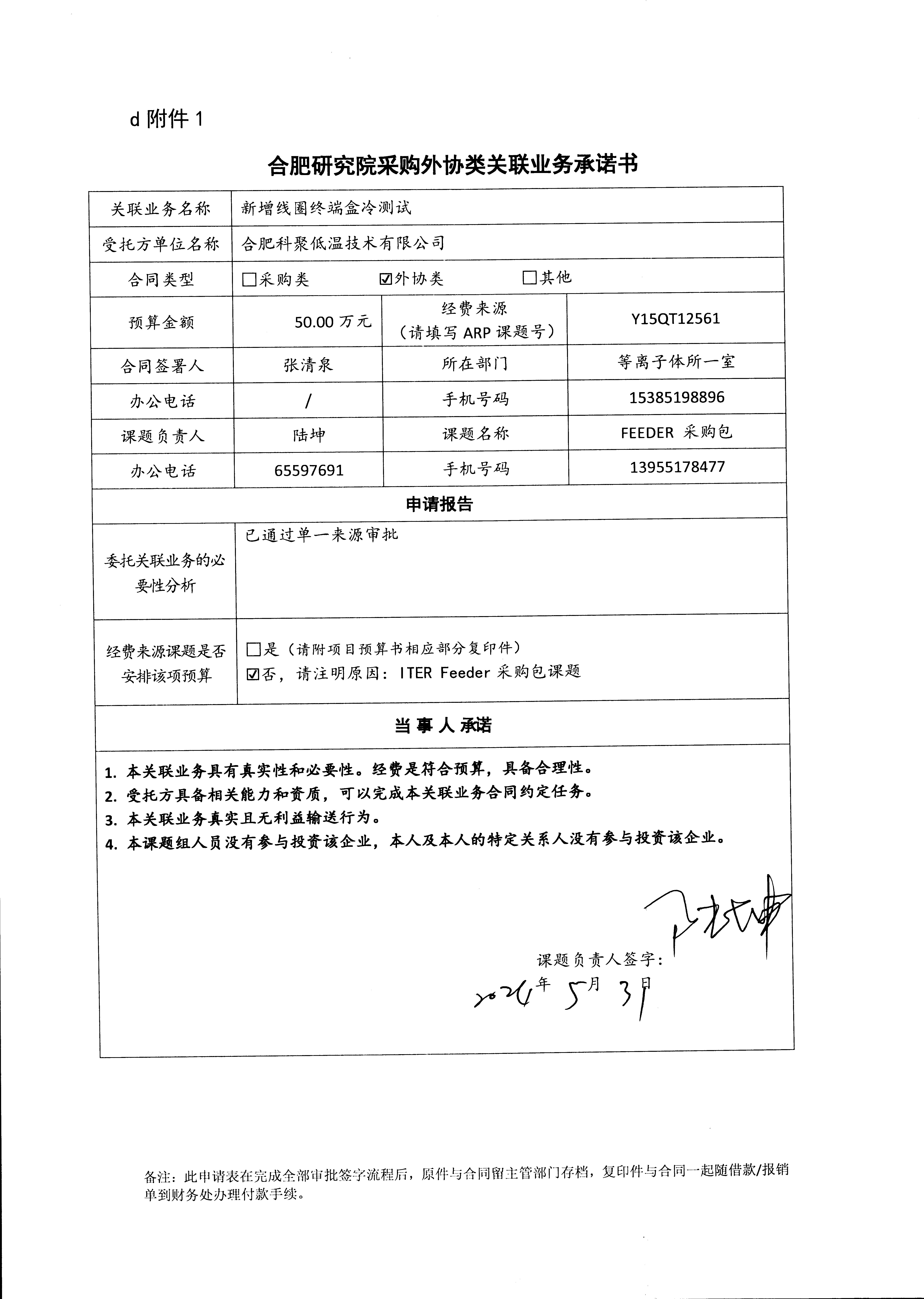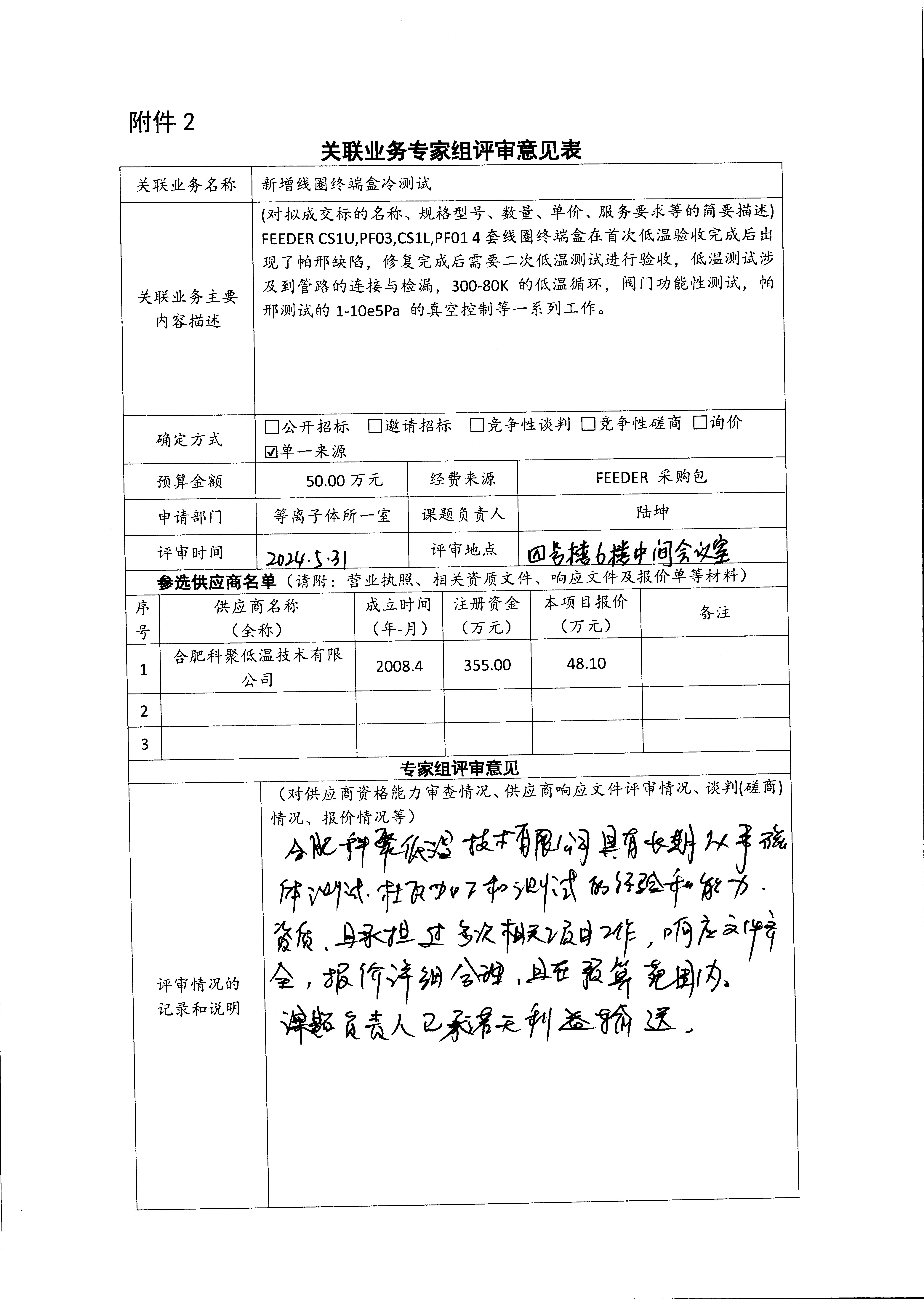 中国科学院合肥物质科学研究院等离子体物理研究所陆坤老师委托合肥科聚低温技术有限公司进行新增线图终端盒冷测试。该测试主要是完成FEEDER CS1U,PF03,CS1L,PF01 4套线圈终端盒的二次低温测试验收。上述4套线圈终端盒在首次低温验收完成后出现了帕邢缺陷,修复完成后需要二次低温测试进行验收。低温验收主要工作内容有低温管路的连接与检漏,300-80K 的低温循环,阀门功能性测试,帕邢测试的1-105Pa 的真空控制等一系列工作。合肥科聚低温技术有限公司股东包括合肥科聚高技术有限责任公司,持股比例60%,合肥科学岛控股公司持有合肥科聚高技术有限责任公司100%的股份,本次采购构成关联业务交易。