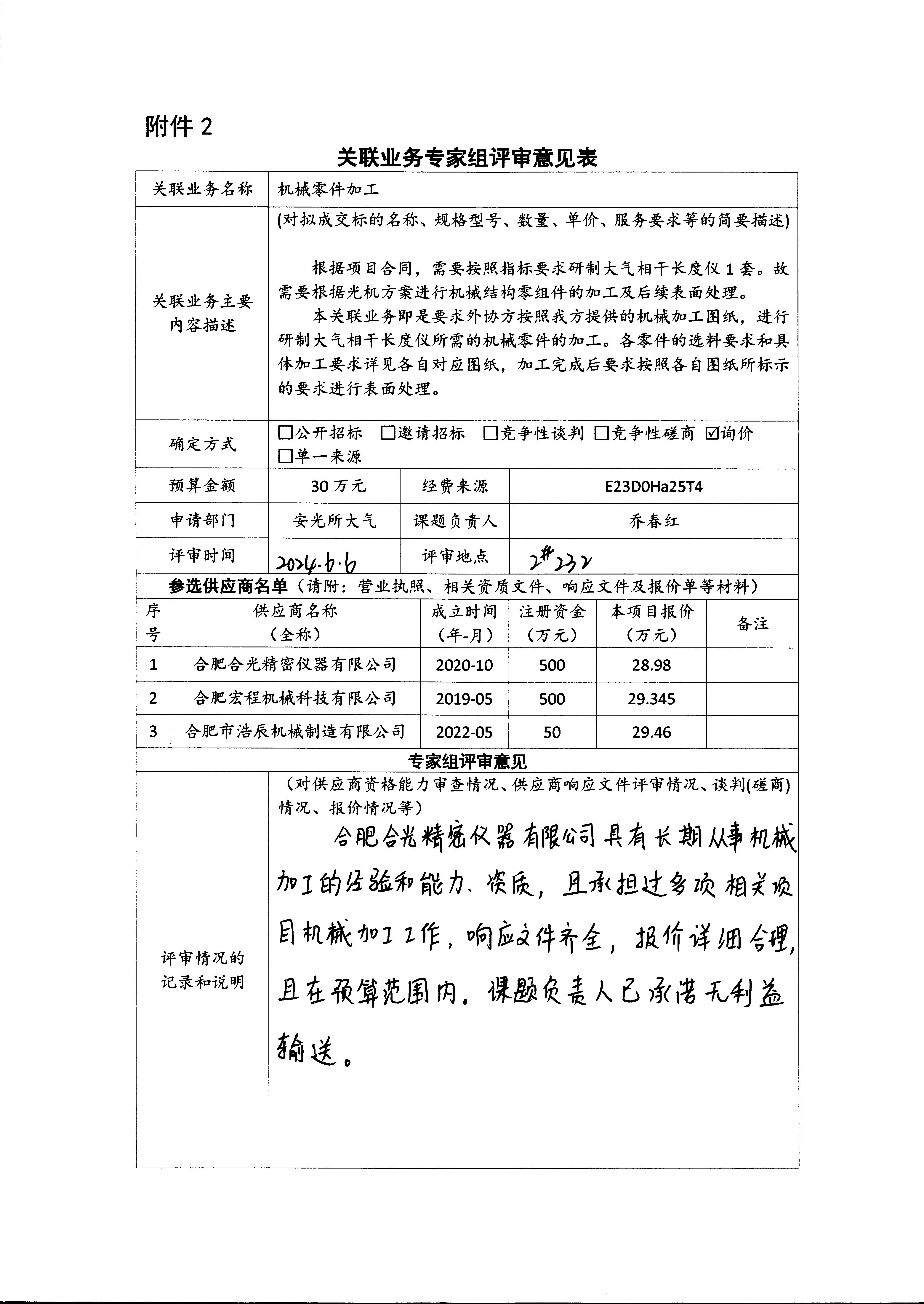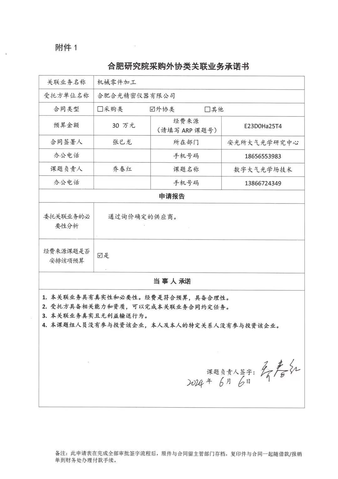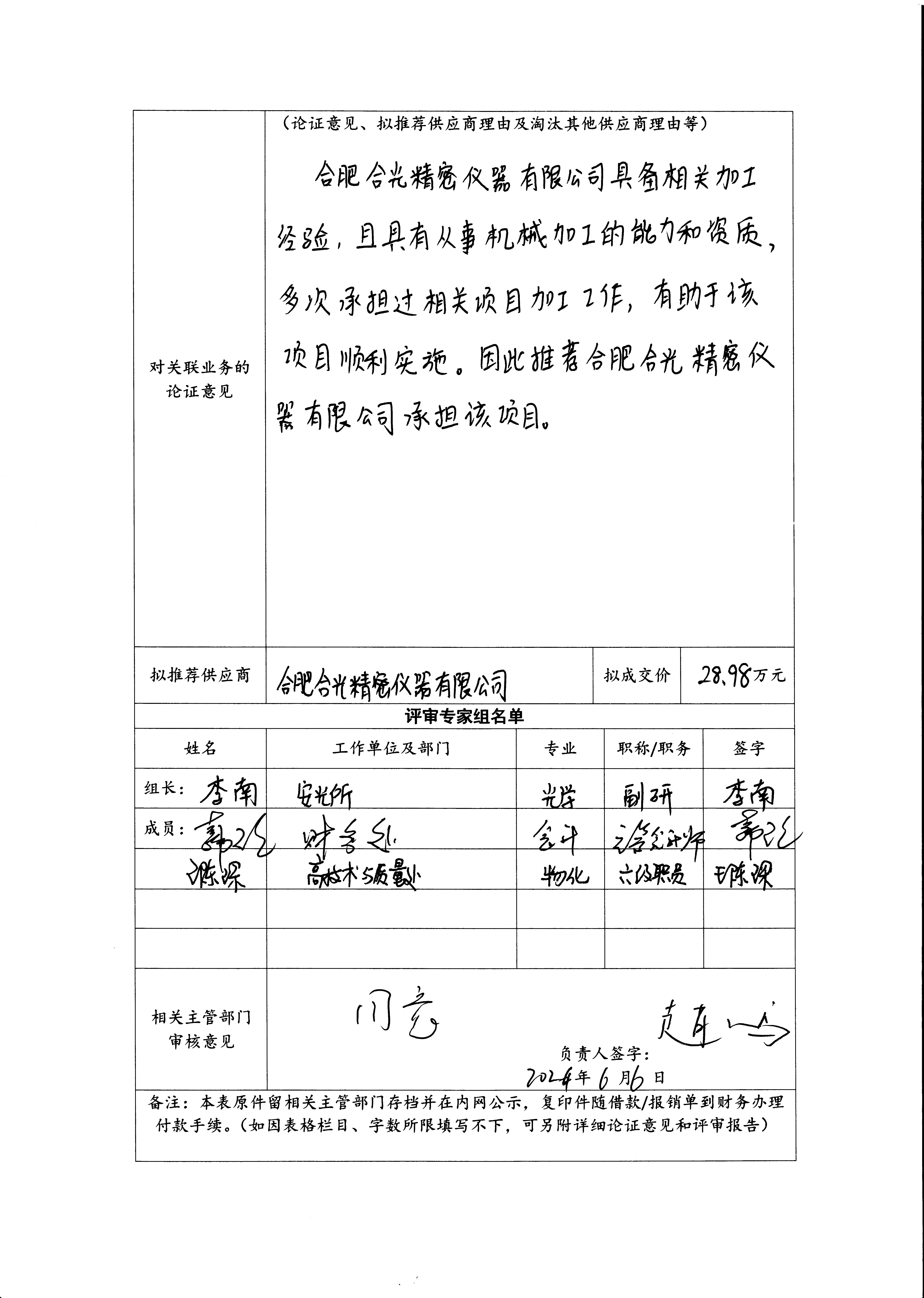 根据《中国科学院关于加强科研项目关联业务管理的暂行规定》(科发条财字〔2015〕125号)、《中国科学院合肥物质科学研究院关于加强科研项目关联业务管理的实施细则》(科合院发资字〔2021〕8号)、《合肥研究院加强关联业务管理暂行办法》(科合院发资字〔2022〕1号)要求,现就我院委托合肥合光精密仪器有限公司进行机械零件加工进行关联业务公示。