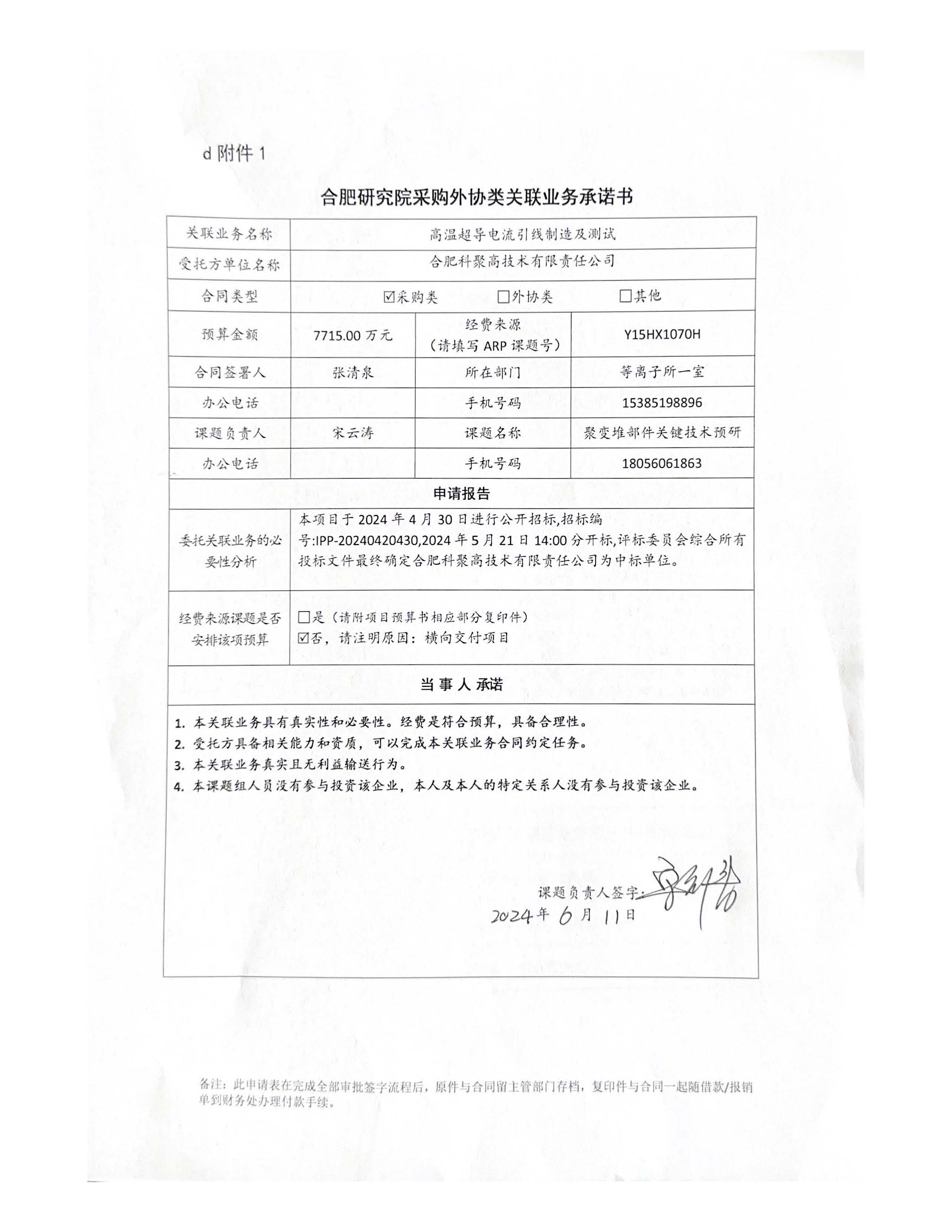 中国科学院合肥物质科学研究院等离子体物理研究所张新泉老师委托委托合肥科聚高技术有限责任公司进行高温超导电流引线制造及测试,该项目包含44根55kA高温超导电流引线,8根35kA高温超导电流引线和18根17kA高温超导电流引线的制造及测试。高温超导电流引线(HTSCL)是Feeder核心部件,是电流引线罐(CLB)重要组成部分,为磁体提供电源,传输冷质用来控制自身温度确保电源稳定供应,在故障态下作为磁体储能的泄放通道,确保磁体能量及时安全的泄放。合肥科聚高技术有限责任公司自然人股东包括合肥科学岛控股有限公司,持股比例100%,本次采购构成关联业务交易。