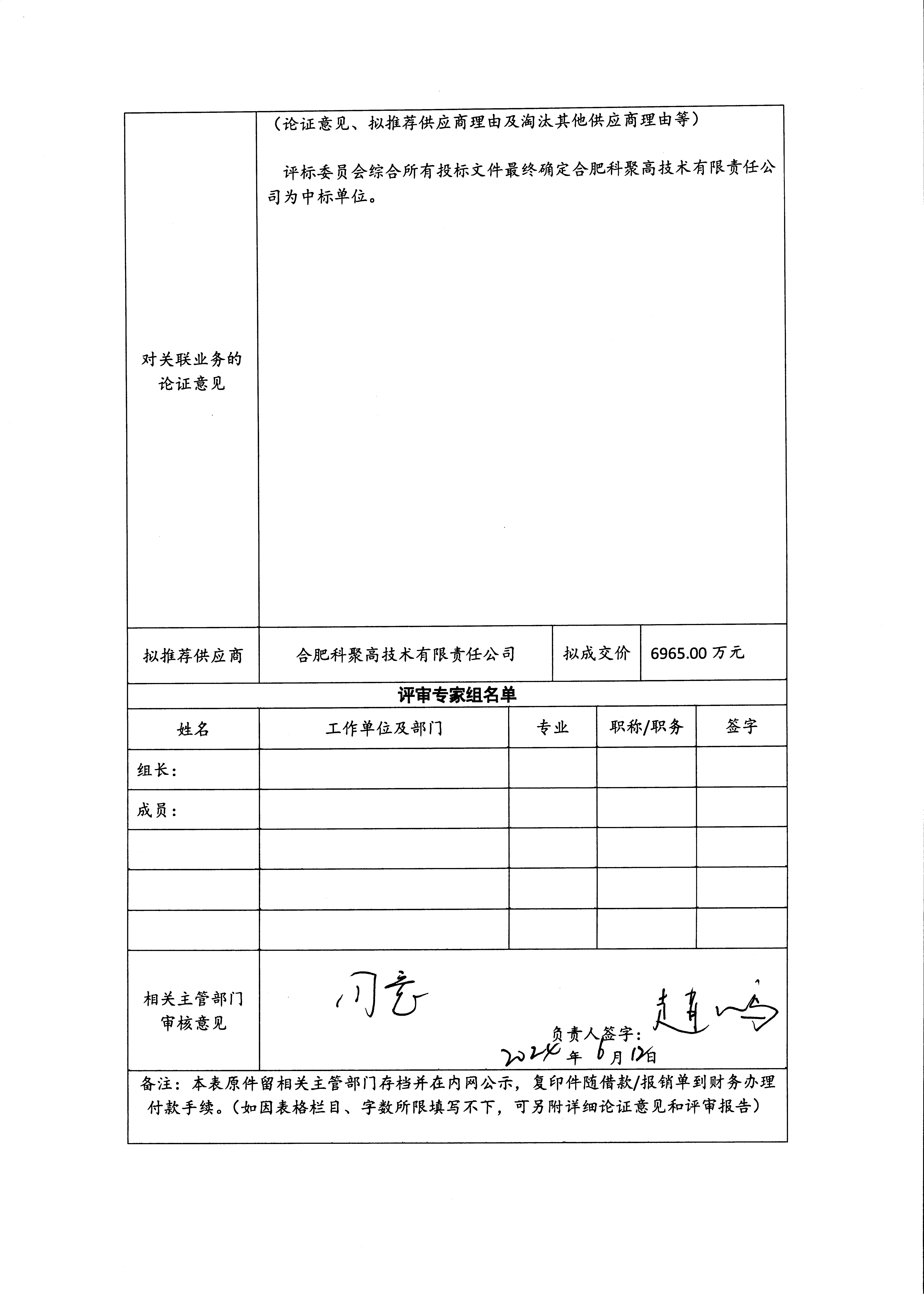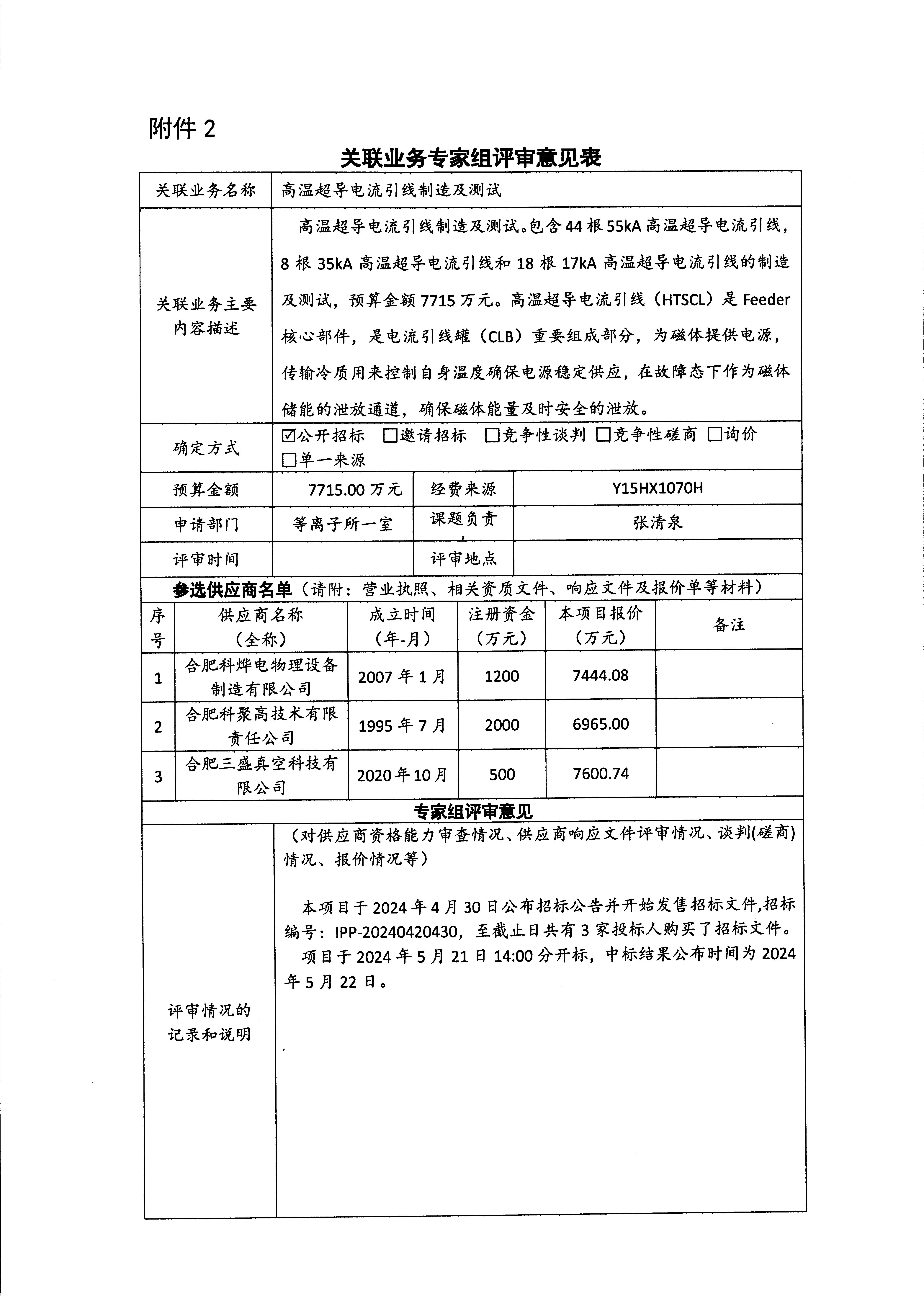 根据《中国科学院关于加强科研项目关联业务管理的暂行规定》(科发条财字〔2015〕125号)、《中国科学院合肥物质科学研究院关于加强科研项目关联业务管理的实施细则》(科合院发资字〔2021〕8号)、《合肥研究院加强关联业务管理暂行办法》(科合院发资字〔2022〕1号)要求,现就我院委托合肥科聚高技术有限责任公司进行高温超导电流引线制造及测试的关联业务进行公示。