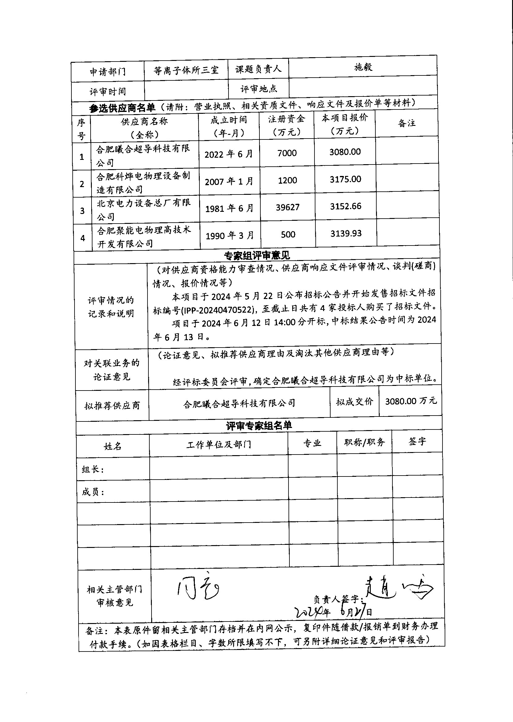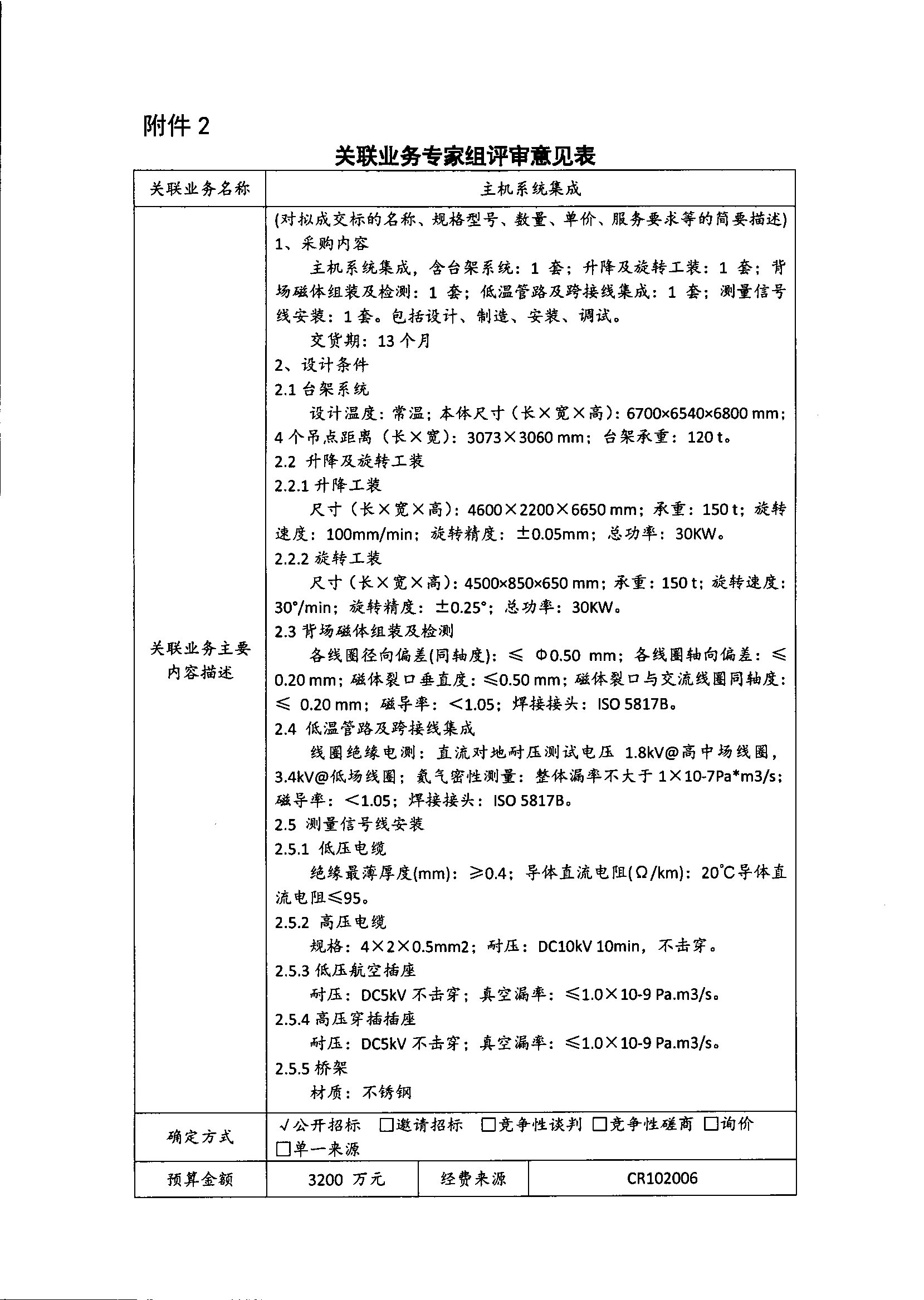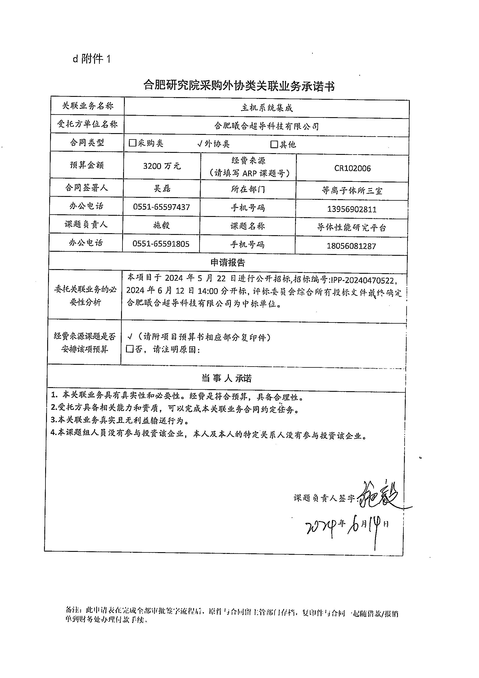 根据《中国科学院关于加强科研项目关联业务管理的暂行规定》(科发条财字〔2015〕125号)、《中国科学院合肥物质科学研究院关于加强科研项目关联业务管理的实施细则》(科合院发资字〔2021〕8号)、《合肥研究院加强关联业务管理暂行办法》(科合院发资字〔2022〕1号)要求,现就我院委托合肥曦合超导科技有限公司集成主机系统的关联业务进行公示。