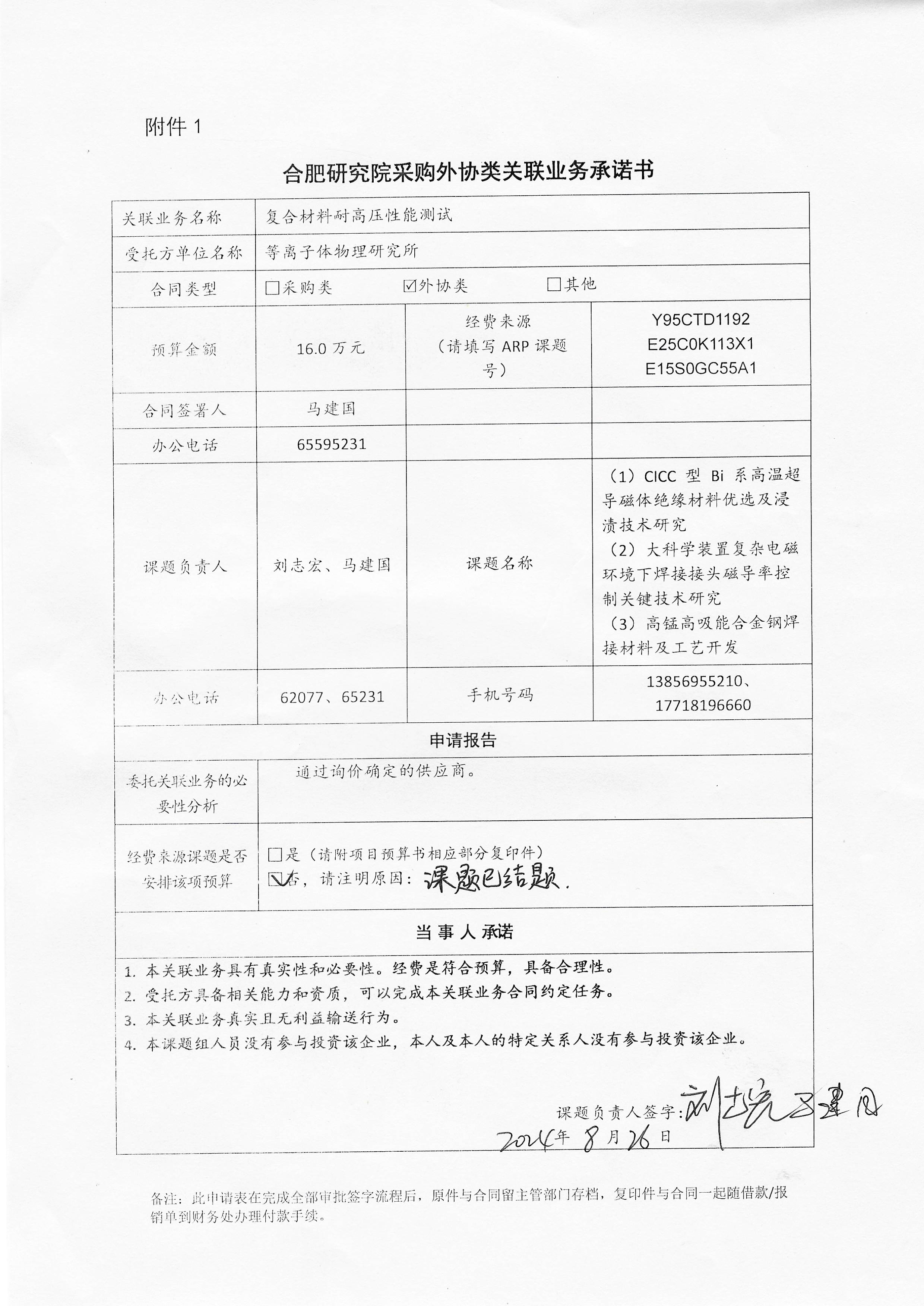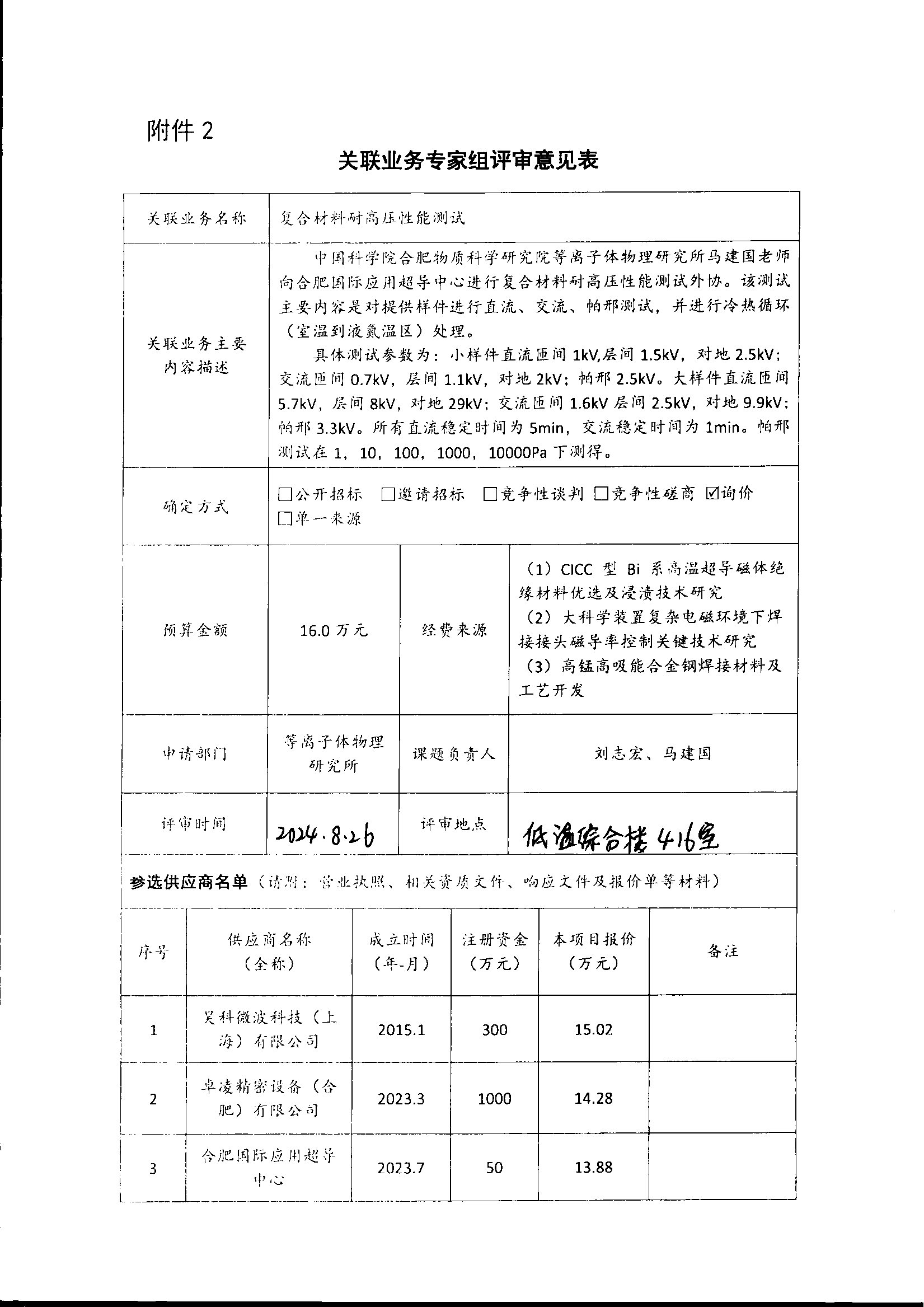 根据《中国科学院关于加强科研项目关联业务管理的暂行规定》(科发条财字〔2015〕125号)、《中国科学院合肥物质科学研究院关于加强科研项目关联业务管理的实施细则》(科合院发资字〔2021〕8号)、《合肥研究院加强关联业务管理暂行办法》(科合院发资字〔2022〕1号)要求,现就我院委托合肥国际应用超导中心进行复合材料高压性能测试项目进行关联业务公示。