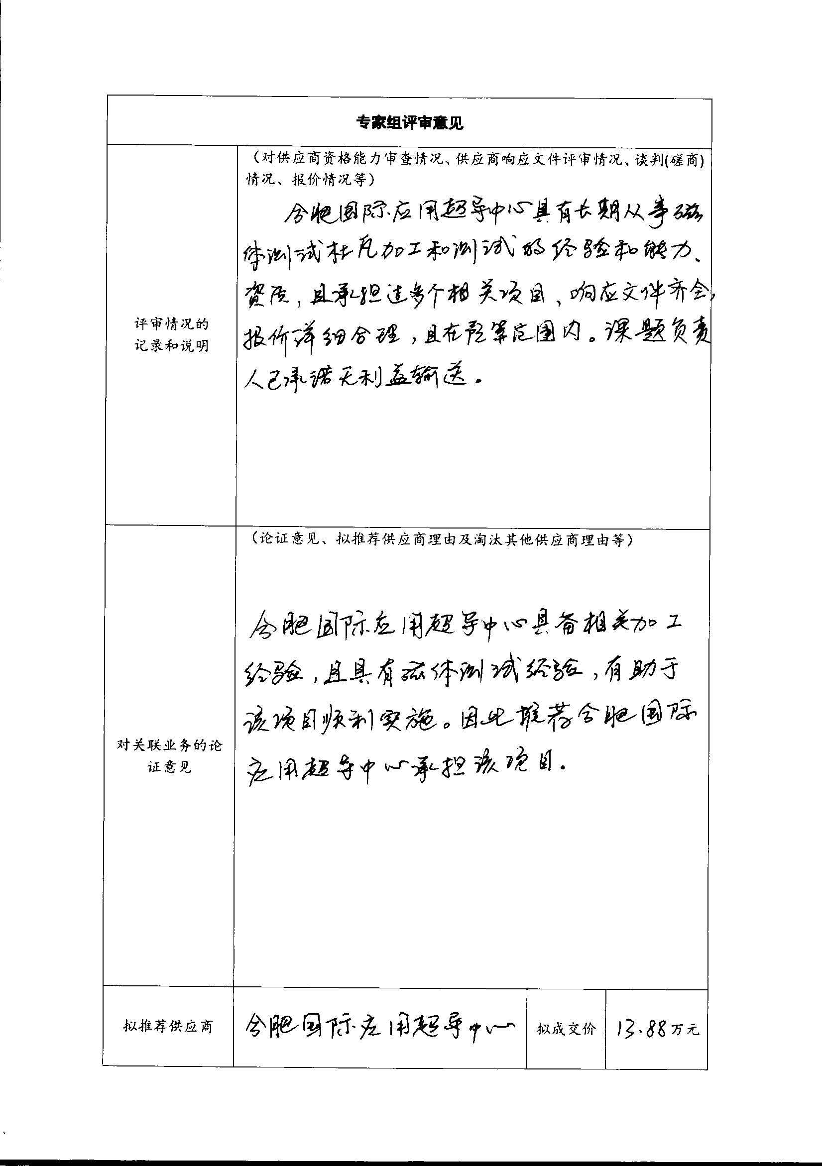 中国科学院合肥物质科学研究院等离子体物理研究所刘志宏、马建国老师委托合肥国际应用超导中心进行复合材料高压性能测试。该测试主要内容是对提供样件进行直流、交流、帕邢测试,并进行冷热循环(室温到液氮温区)处理。具体测试参数为:小样件直流匝间1kV,层间1.5kV,对地2.5kV;交流匝间0.7kV,层间1.1kV,对地2kV;帕邢2.5kV。大样件直流匝间5.7kV,层间8kV,对地29kV;交流匝间1.6kV层间2.5kV,对地9.9kV;帕邢3.3kV。所有直流稳定时间为5min,交流稳定时间为1min。帕邢测试在1,10,100,1000,10000Pa下测得。合肥国际应用超导中心由合肥科学岛控股有限公司与合肥经济技术开发区管理委员会共同发起组建,本次服务构成关联业务交易。