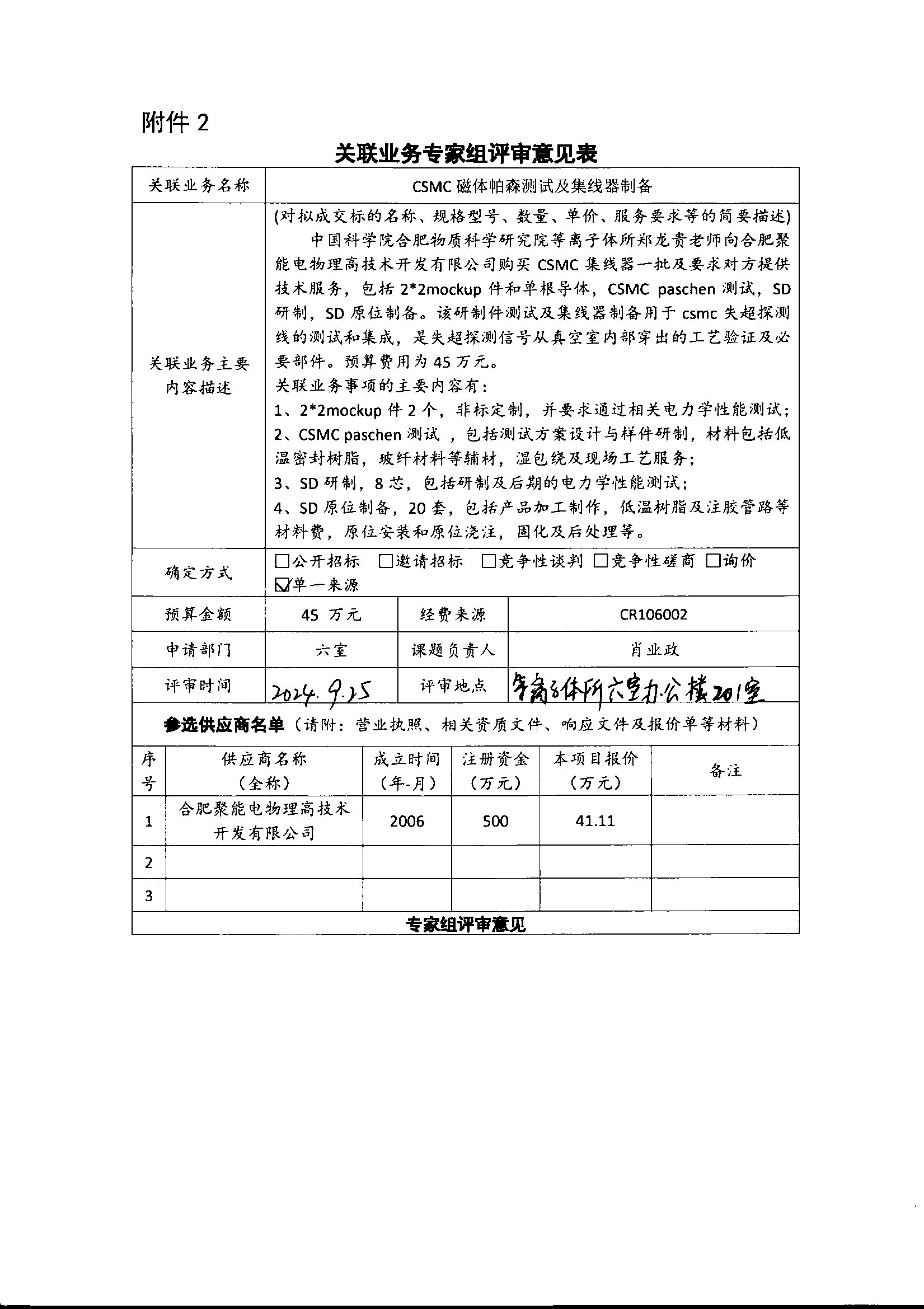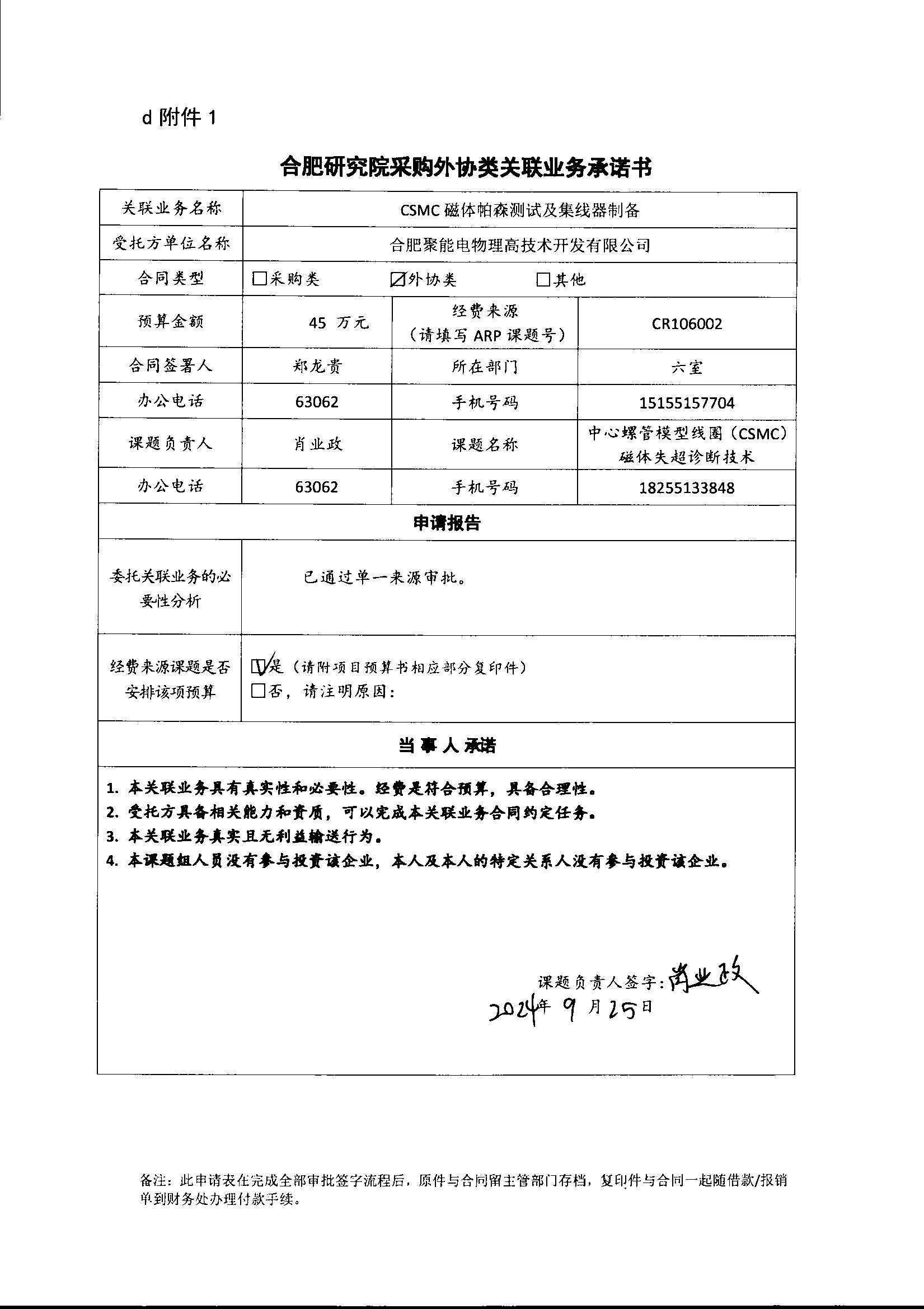 中国科学院合肥物质科学研究院等离子体物理研究所肖业政老师委托合肥聚能电物理高技术开发有限公司进行CSMC磁体帕森测试及集线器制备,包括2*2mockup件和单根导体,CSMC paschen测试,SD研制,SD原位制备。该研制件测试及集线器制备用于csmc失超探测线的测试和集成,是失超探测信号从真空室内部穿出的工艺验证及必要部件。合肥聚能电物理高技术开发有限公司股东包括合肥科学岛控股有限公司,占该公司35%的股份,本次构成关联业务交易。