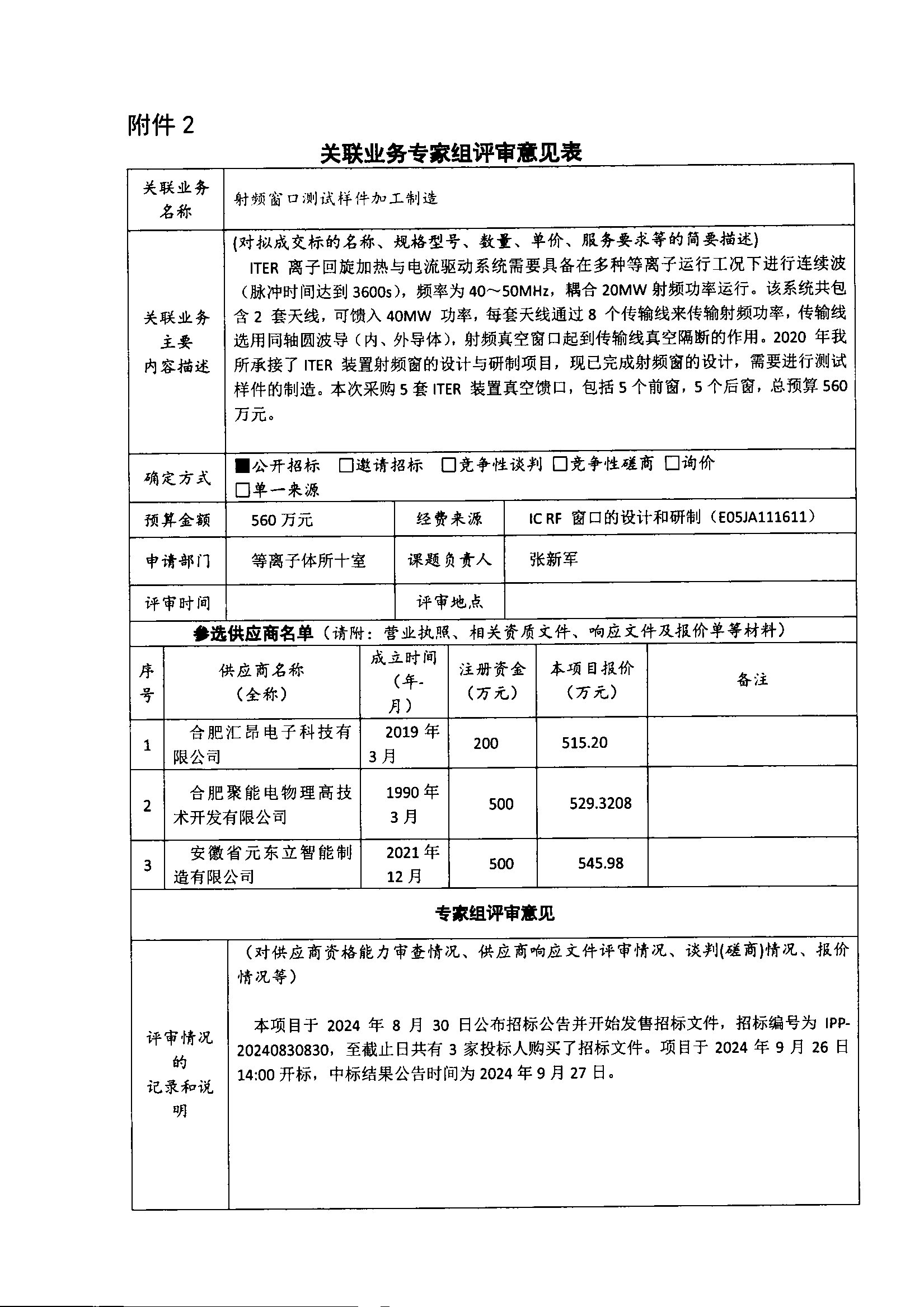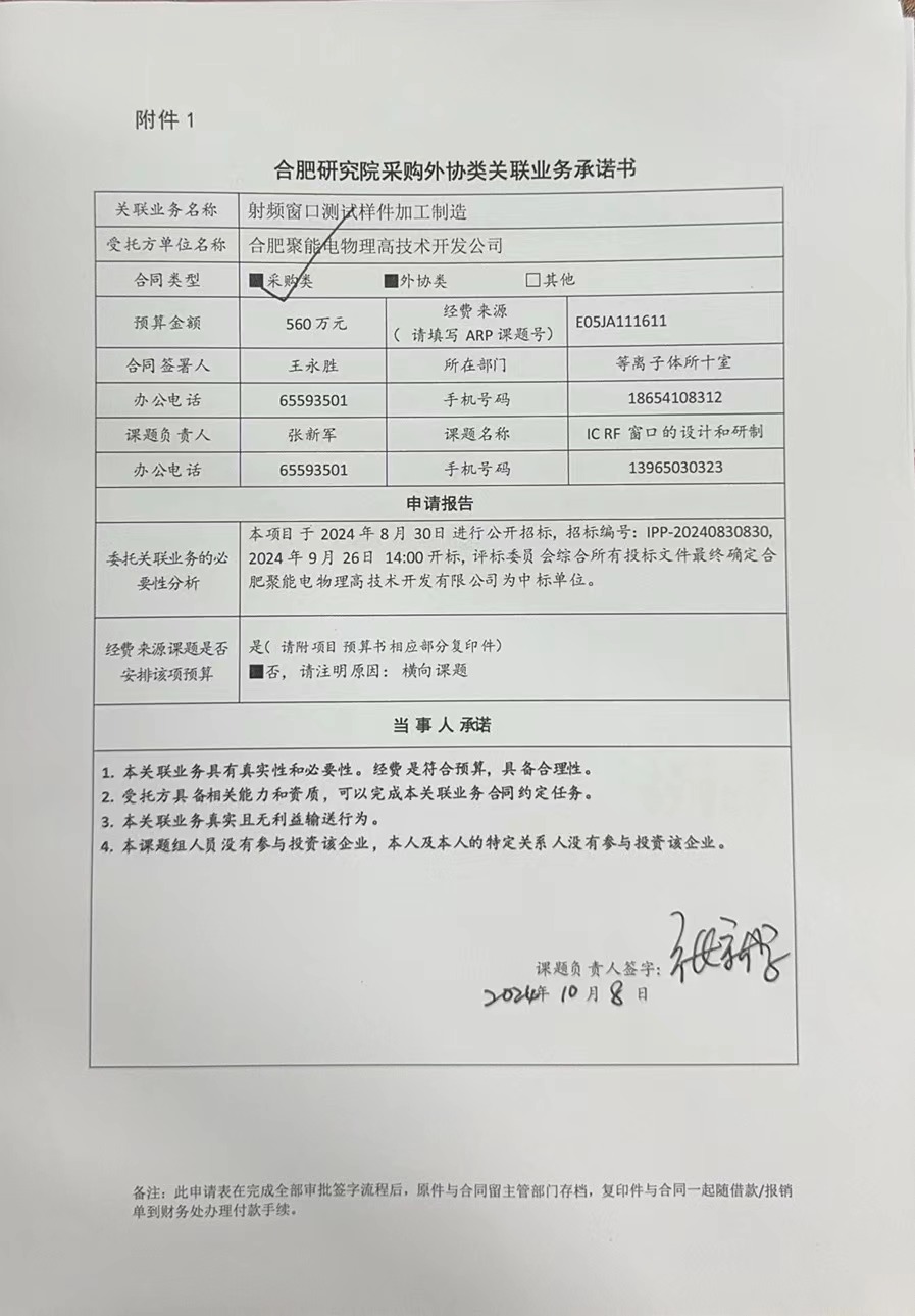 根据《中国科学院关于加强科研项目关联业务管理的暂行规定》(科发条财字〔2015〕125号)、《中国科学院合肥物质科学研究院关于加强科研项目关联业务管理的实施细则》(科合院发资字〔2021〕8号)、《合肥研究院加强关联业务管理暂行办法》(科合院发资字〔2022〕1号)要求,现就我院委托合肥聚能电物理高技术开发有限公司进行射频窗口测试样件加工制造项目进行关联业务公示。
