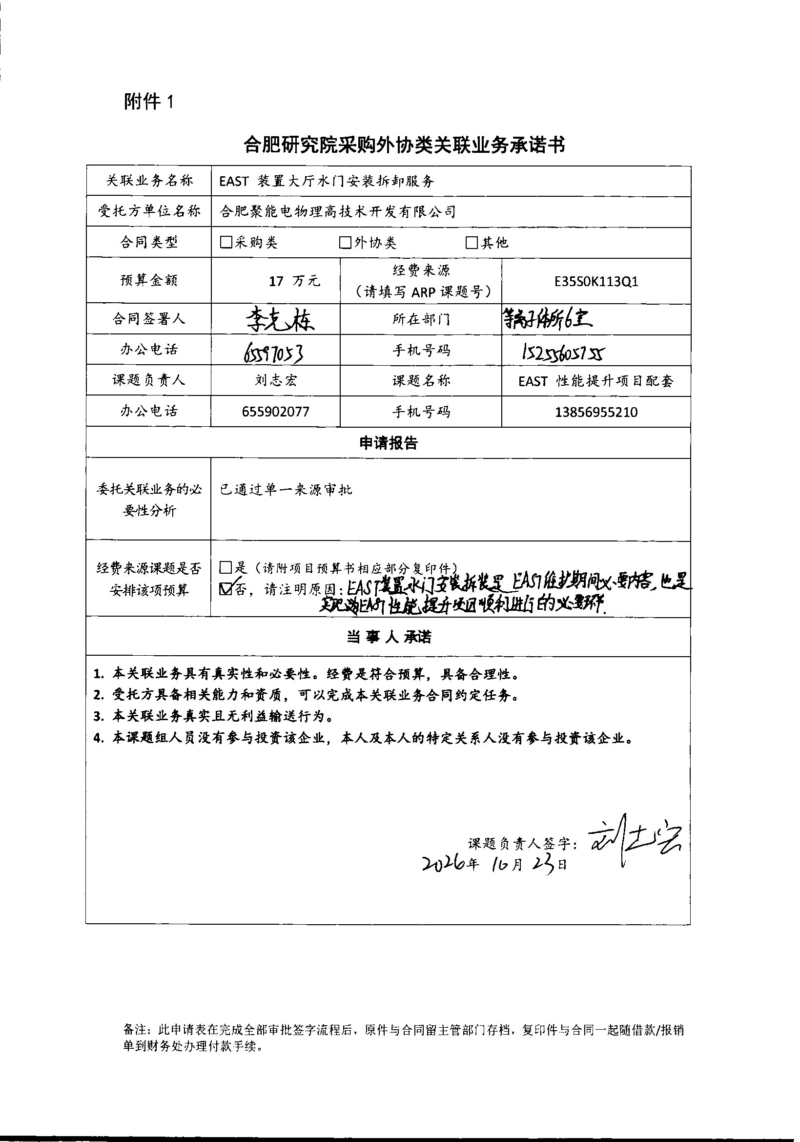根据《中国科学院关于加强科研项目关联业务管理的暂行规定》(科发条财字〔2015〕125号)、《中国科学院合肥物质科学研究院关于加强科研项目关联业务管理的实施细则》(科合院发资字〔2021〕8号)、《合肥研究院加强关联业务管理暂行办法》(科合院发资字〔2022〕1号)要求,现就我院委托合肥聚能电物理高技术开发有限公司进行EAST装置大厅水门安装拆卸服务项目进行关联业务公示。