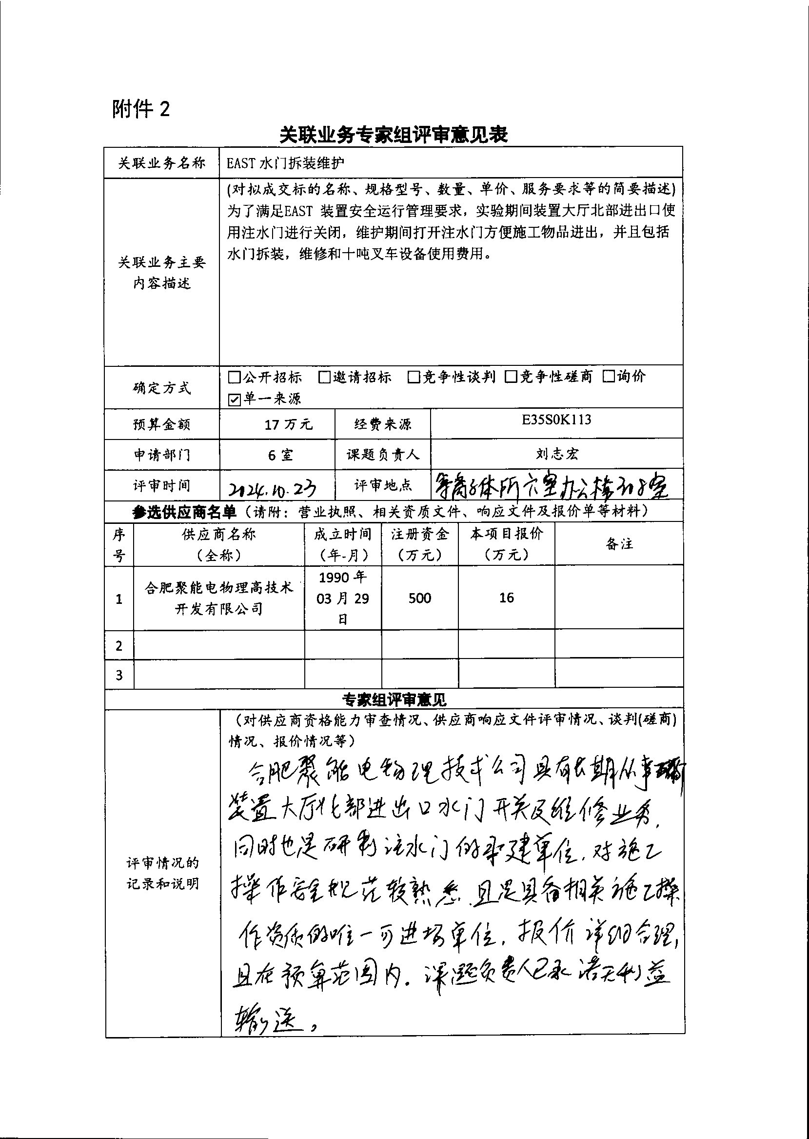 中国科学院合肥物质科学研究院等离子体物理研究所刘志宏老师委托合肥聚能电物理高技术开发有限公司进行EAST装置大厅水门安装拆卸服务。为了满足EAST 装置安全运行管理要求,实验期间装置大厅北部进出口使用注水门进行关闭,维护期间打开注水门方便施工物品进出。合肥聚能电物理高技术开发有限公司股东包括合肥科学岛控股有限公司,占该公司35%的股份,本次构成关联业务交易。