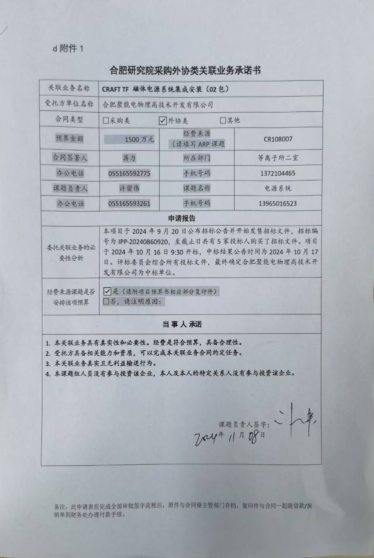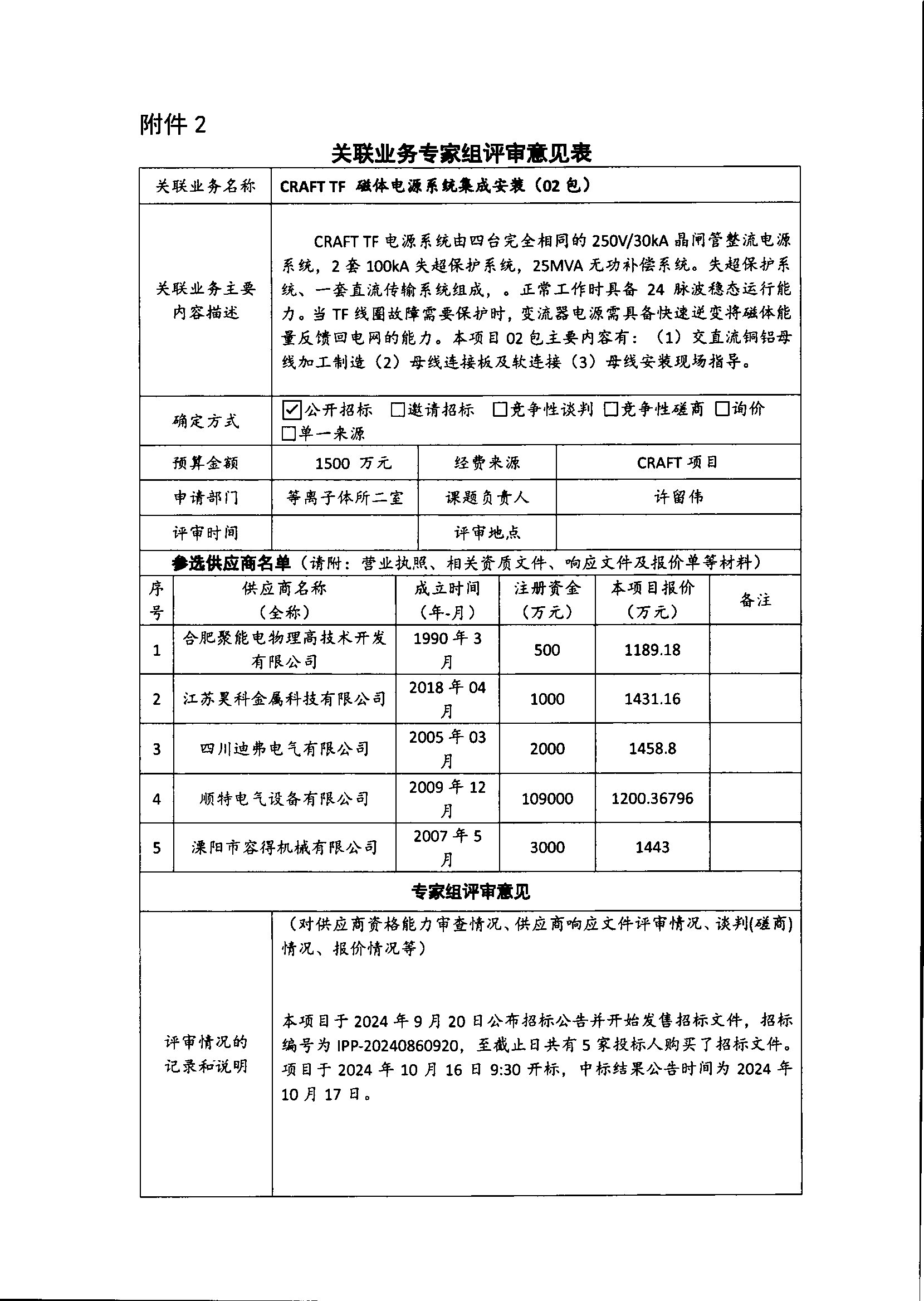 根据《中国科学院关于加强科研项目关联业务管理的暂行规定》(科发条财字〔2015〕125号)、《中国科学院合肥物质科学研究院关于加强科研项目关联业务管理的实施细则》(科合院发资字〔2021〕8号)、《合肥研究院加强关联业务管理暂行办法》(科合院发资字〔2022〕1号)要求,现就我院委托合肥聚能电物理高技术开发有限公司进行CRAFT TF 磁体电源系统集成安装(02包)项目进行关联业务公示。