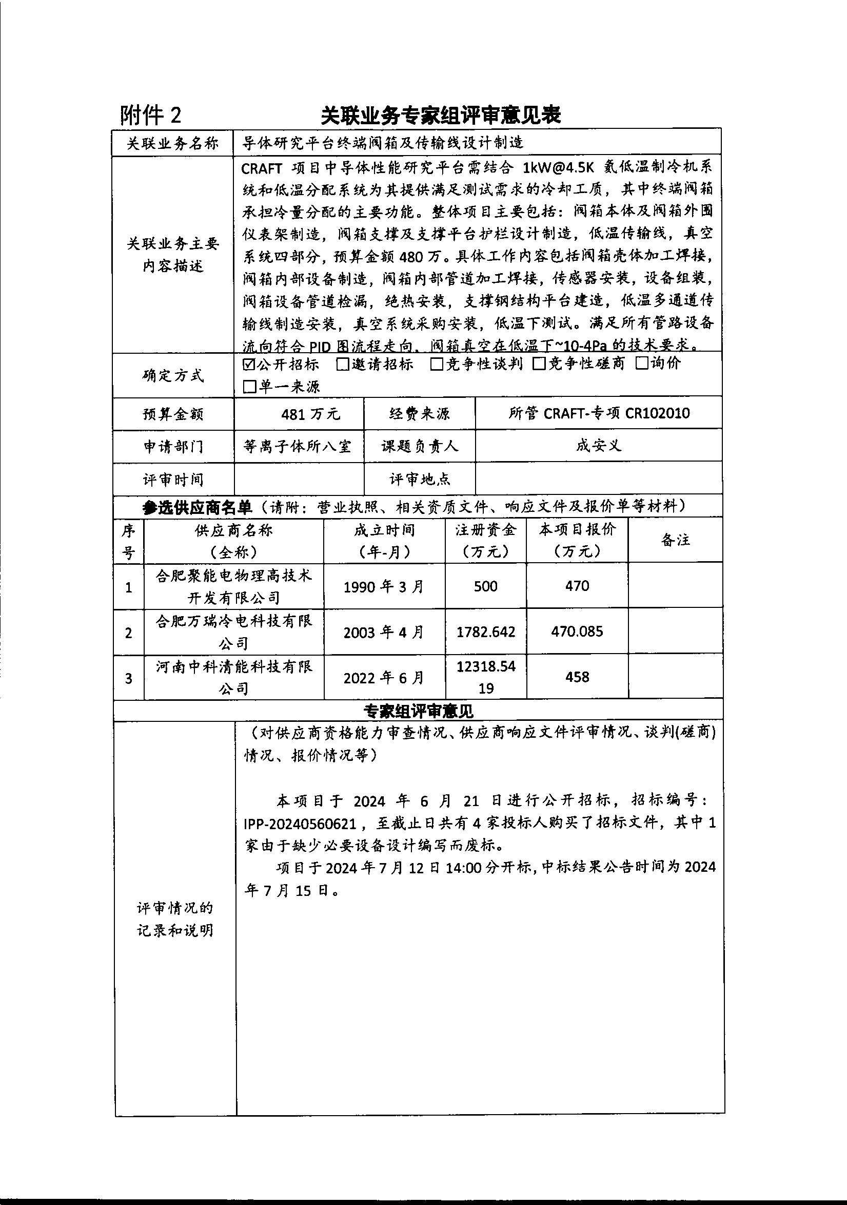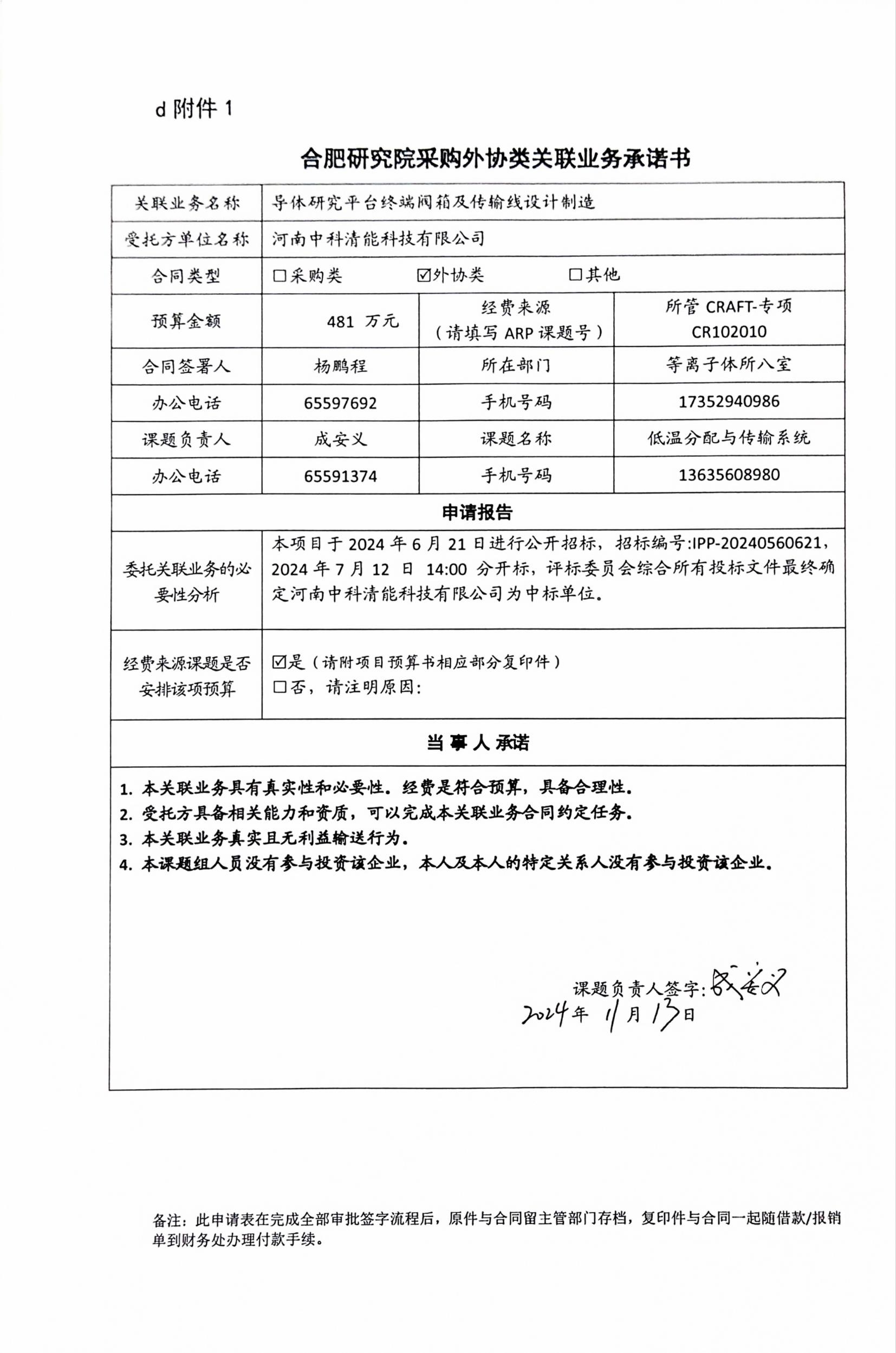 根据《中国科学院关于加强科研项目关联业务管理的暂行规定》(科发条财字〔2015〕125号)、《中国科学院合肥物质科学研究院关于加强科研项目关联业务管理的实施细则》(科合院发资字〔2021〕8号)、《合肥研究院加强关联业务管理暂行办法》(科合院发资字〔2022〕1号)要求,现就我院委托河南中科清能科技有限公司进行导体研究平台终端阀箱及传输线设计制造项目进行关联业务公示。