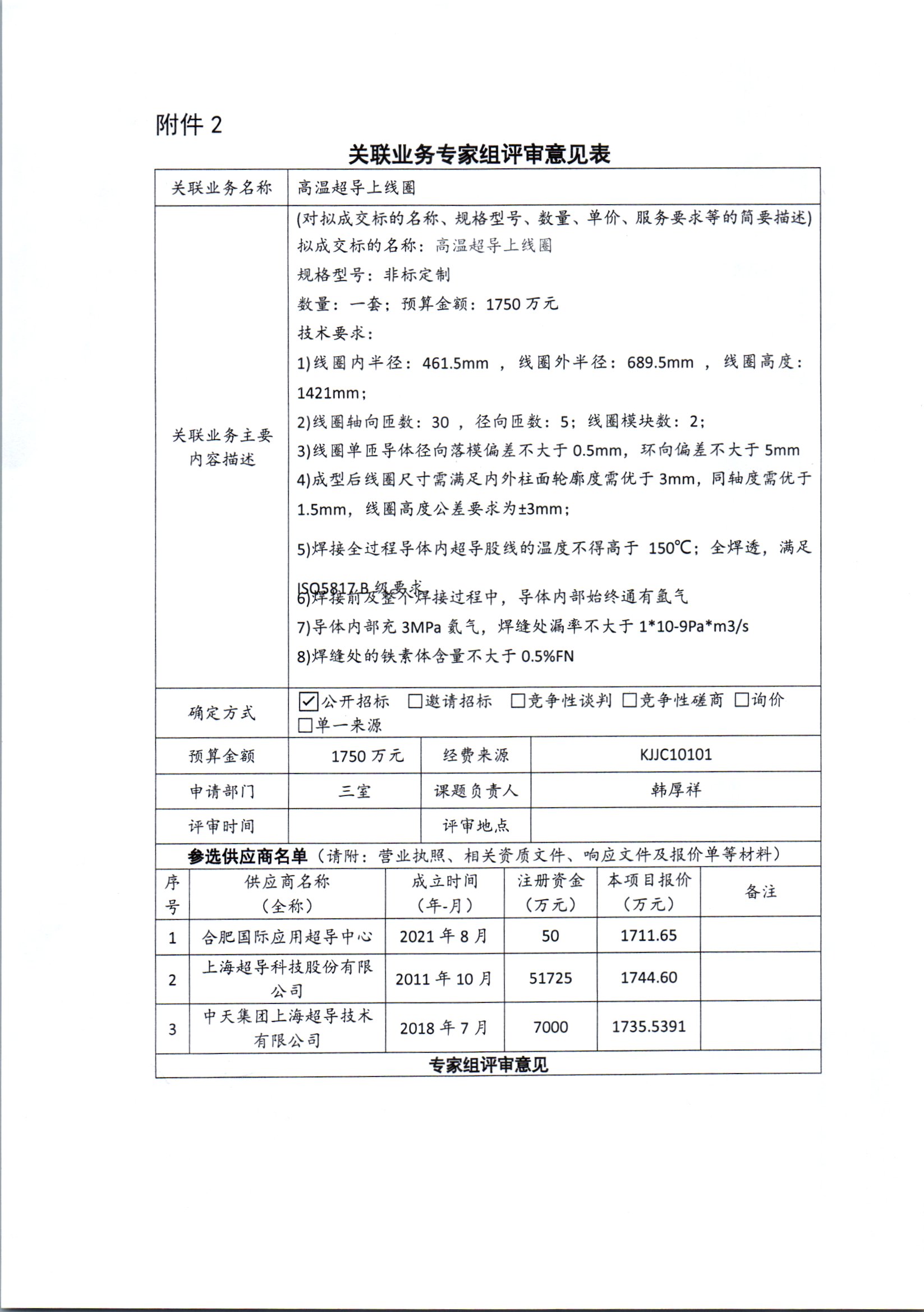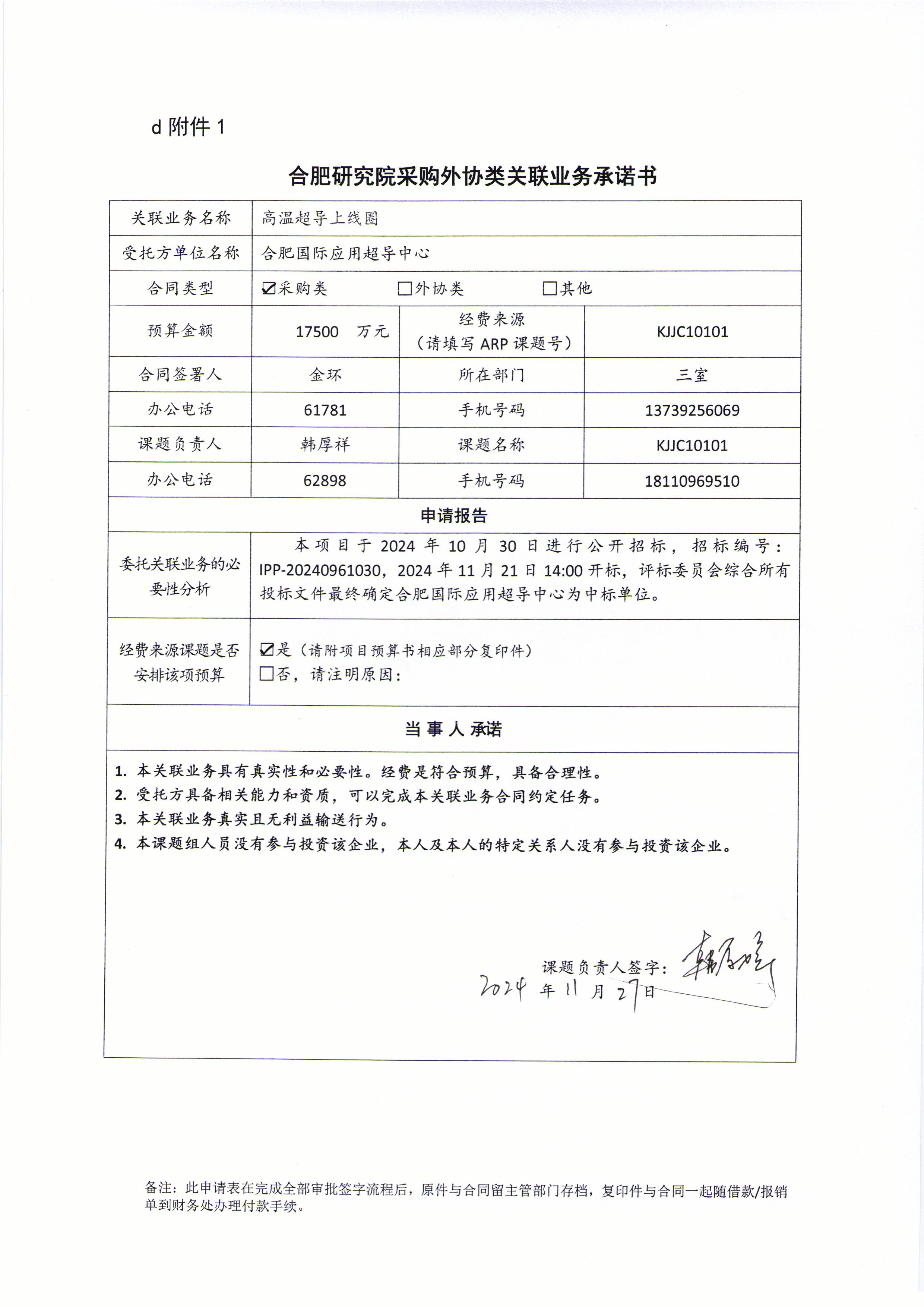 根据《中国科学院关于加强科研项目关联业务管理的暂行规定》(科发条财字〔2015〕125号)、《中国科学院合肥物质科学研究院关于加强科研项目关联业务管理的实施细则》(科合院发资字〔2021〕8号)、《合肥研究院加强关联业务管理暂行办法》(科合院发资字〔2022〕1号)要求,现就我院委托合肥国际应用超导中心研制高温超导上线圈项目进行关联业务公示。